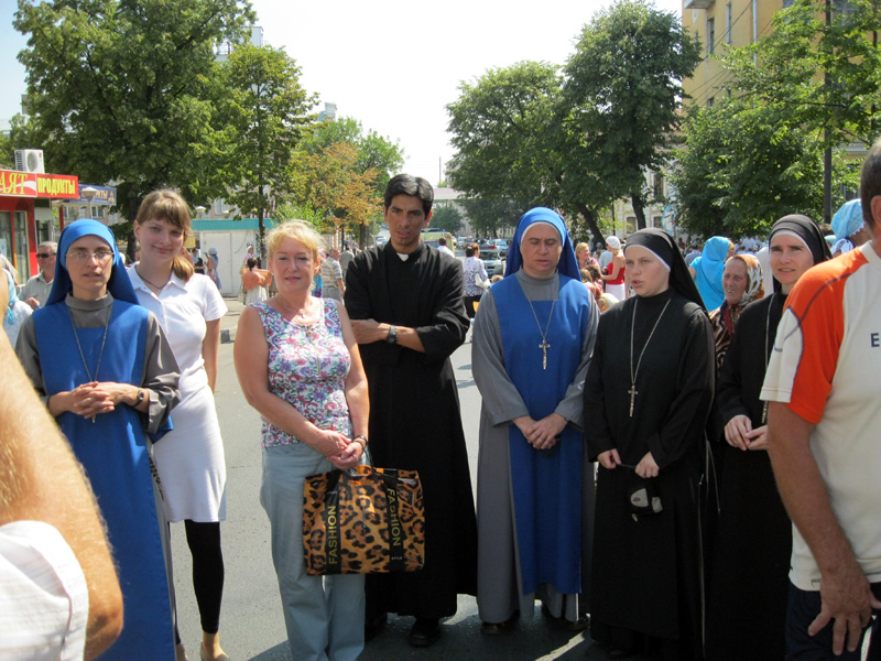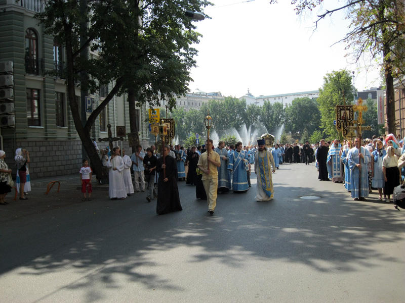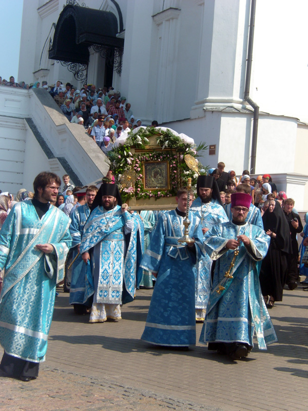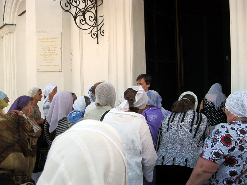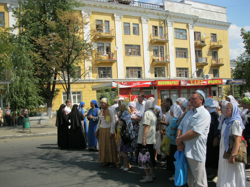 Можно было заметить, как нелегко было идти в такую жаркую погоду верующим, но колокольный звон Петропавловского собора и других окрестных церквей только укреплял путь идущим к Крестовоздвиженскому храму. Каждый, кто просто шел рядом, увидев такое количество людей, останавливался от удивления, из окон и балконов виднелись наблюдательные люди. Еще жарче стало верующим, когда они подошли к тому самому храму, куда и была внесена икона после крестного хода. Церковь не была способна одновременно вместить всех участников Крестного хода и наряды милиции остановили идущих людей. В результате в толпе стало тесно, выйти из нее было невозможно. И затем по очереди, небольшими партиями стали пускать в Крестовоздвиженский собор. Но и долгое ожидание не отпугнуло верующих, все стойко ждали своей очереди. Прихожанам нашего храма пора было уезжать, потому не все успели приложиться к иконе.