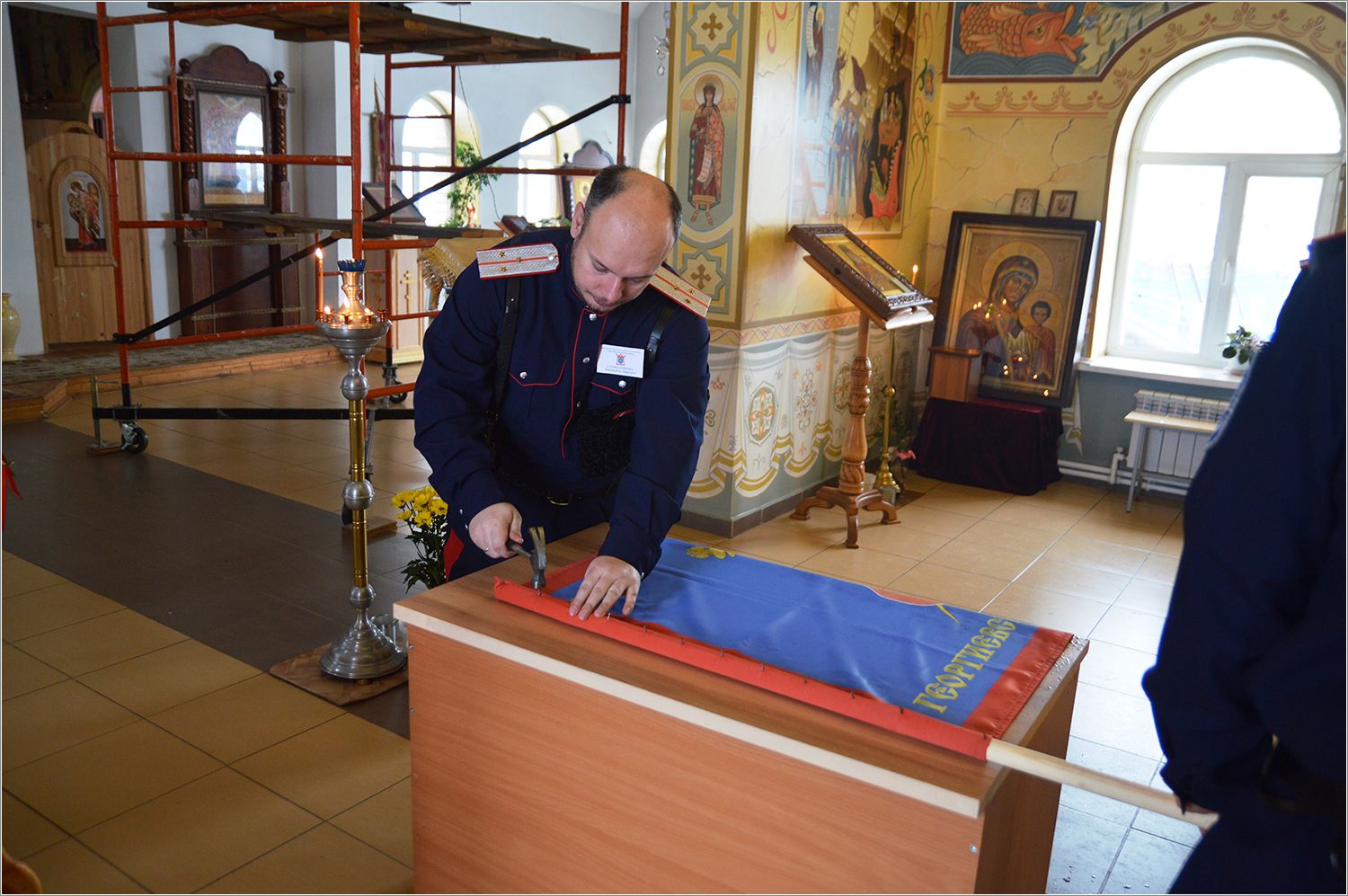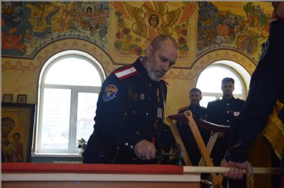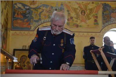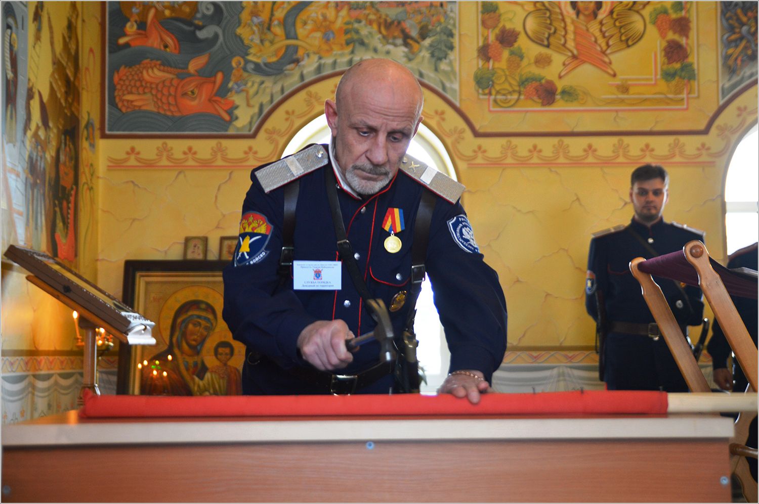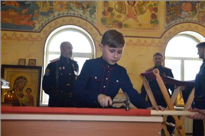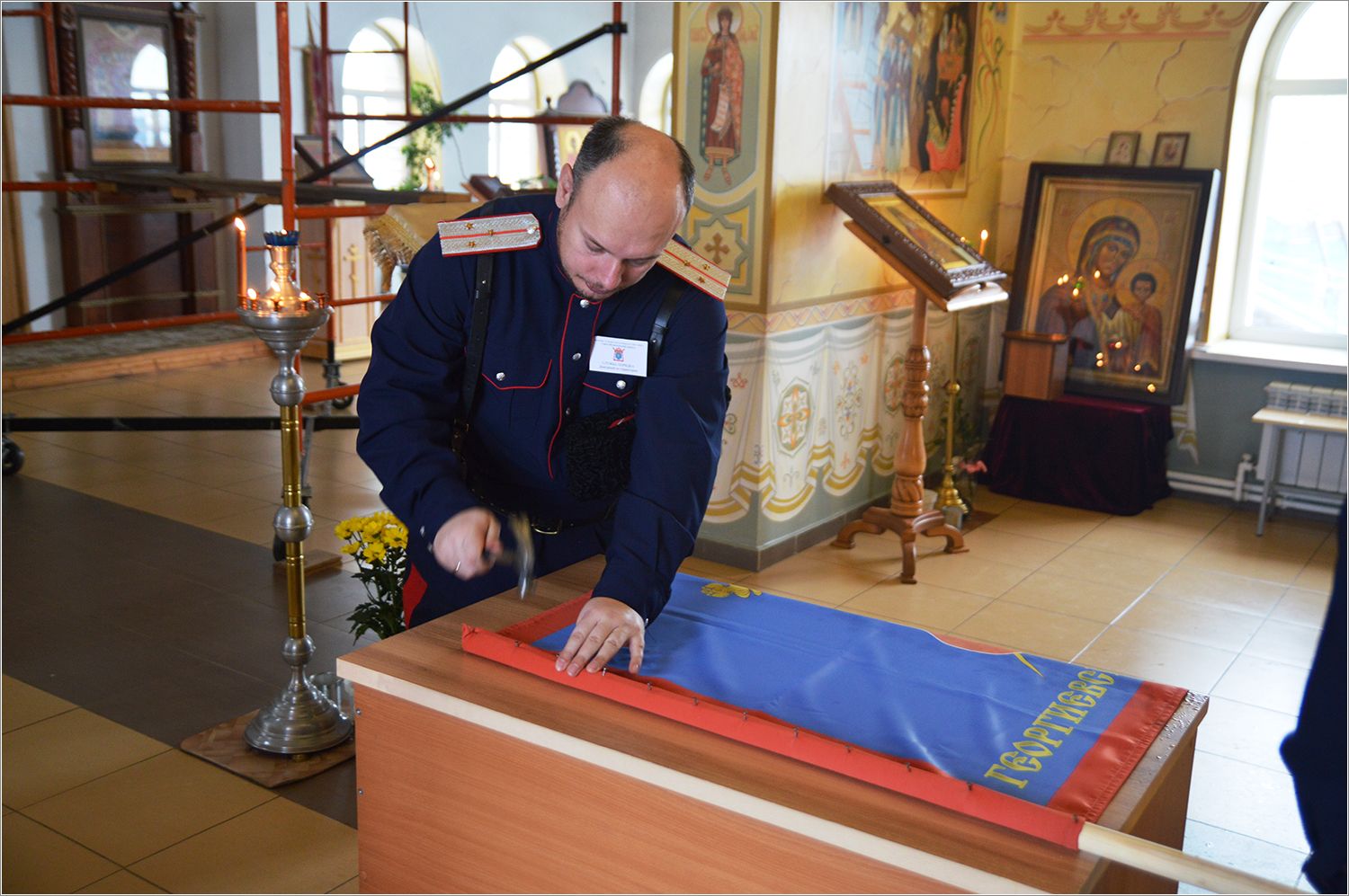 Как духовник Георгиевского десятка, протоиерей Валерий Каранаев возглавил церковное последование, которое завершилось освящением флага и прибивкой его к древку. Честь забить первый гвоздь была дана атаману хутора Юрию Клюкину. Все присутствующие на торжестве казаки Георгиевского десятка смогли принять участие в этом торжественном акте единения. Среди тех, кто взял в этот день молоток, был и юный казаченок подразделения Матвей Быков, который в этот день еще и праздновал свой день рождения.