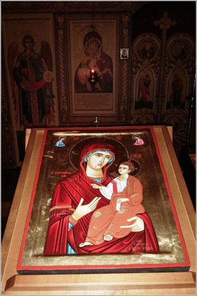 Благотворитель храма в ходе своей поездки приложил икону ко многим святыням этого святого удела Божией Матери. На фотографии икона на фоне иконы Божией Матери «Всецарица» из монастыря Ватопед. В этом монастыре хранится пояс Пресвятой Богородицы и многие святыни Православия.