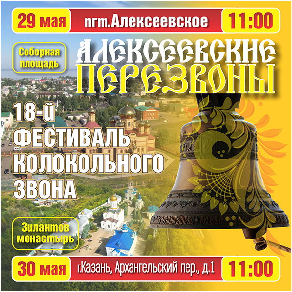 По благословению митрополита Казанского и Татарстанского Кирилла, временного управляющего Чистопольской епархией, 29 мая в п.г.т. Алексеевское пройдет XVIII фестиваль колокольного звона «Алексеевские перезвоны-2021».