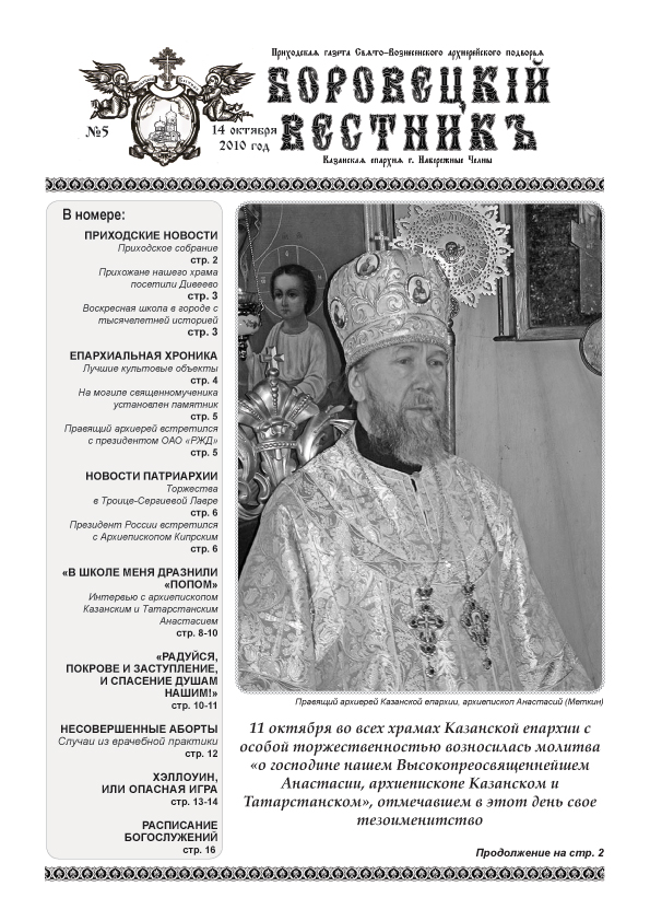 Первые страницы «Боровецкого вестника» знакомят читателей с самыми актуальными событиями, происходящими в жизни Свято-Вознесенского архиерейского подворья, Казанской епархии и всей Русской Православной Церкви.