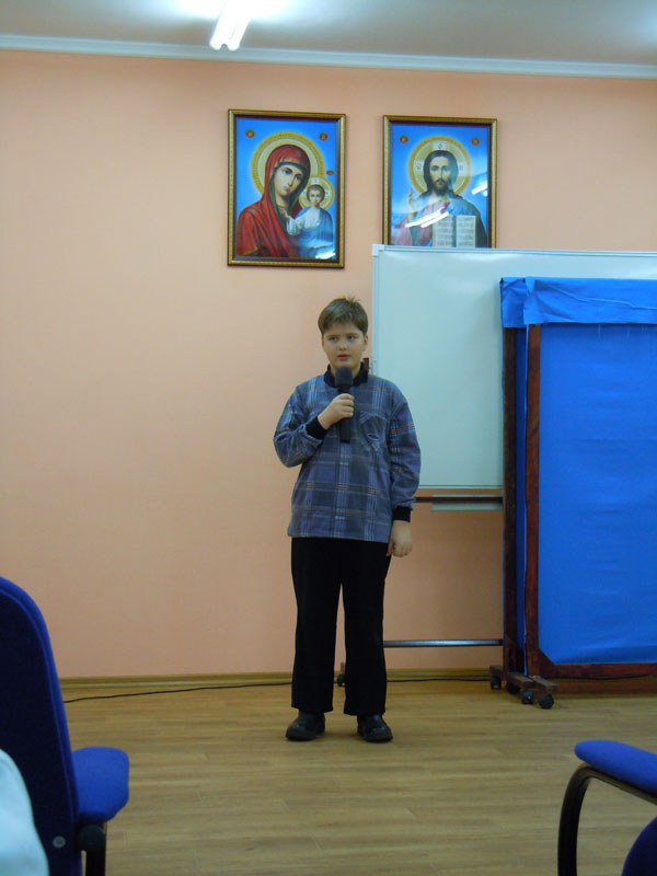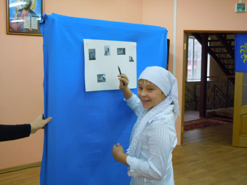 Первый конкурс – «Домашнее задание». Одному участнику каждой из команд предлагалось провести виртуальную экскурсию по любому Елабужскому храму. «Радуга» по жеребьевке выступала первой. И хотя 9-летнему Илюше Половникову было трудновато выговаривать новые для него слова «местночтимые», «классический» и т.п., он выступил вполне достойно.