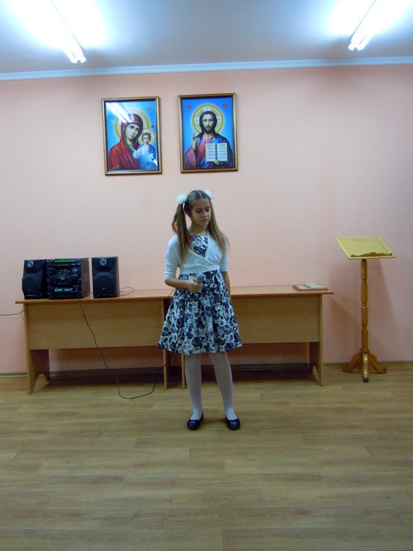 Начался концерт с рассказа ведущей Кораблевой Елены Анатольевны об истории обретения иконы и праздника. Первой выступала Кожевникова Полина с патриотичной песней о России. Слушая эту девочку, сразу представляются лес, ржаное поле, в котором спрятался ручеек, деревянный домик…