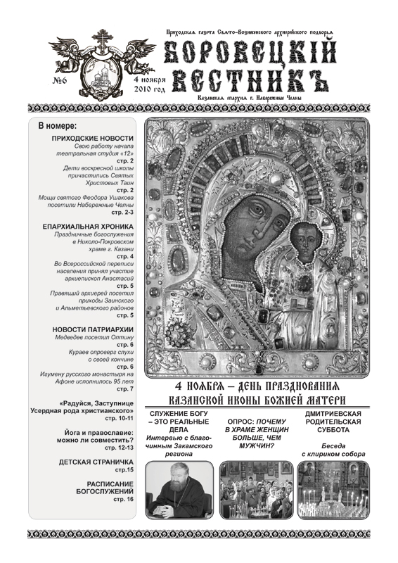 Первые страницы «Боровецкого вестника» знакомят читателей с самыми актуальными событиями, происходящими в жизни Свято-Вознесенского архиерейского подворья, Казанской епархии и всей Русской Православной Церкви.14 ноября отмечает свой престольный праздник храм Космы и Дамиана. К престольному празднику храма нашего города редакция газеты предлагает вниманию читателей интервью с настоятелем храма святых бессребреников и благочинным Закамского региона протоиереем Олегом Богдановым.