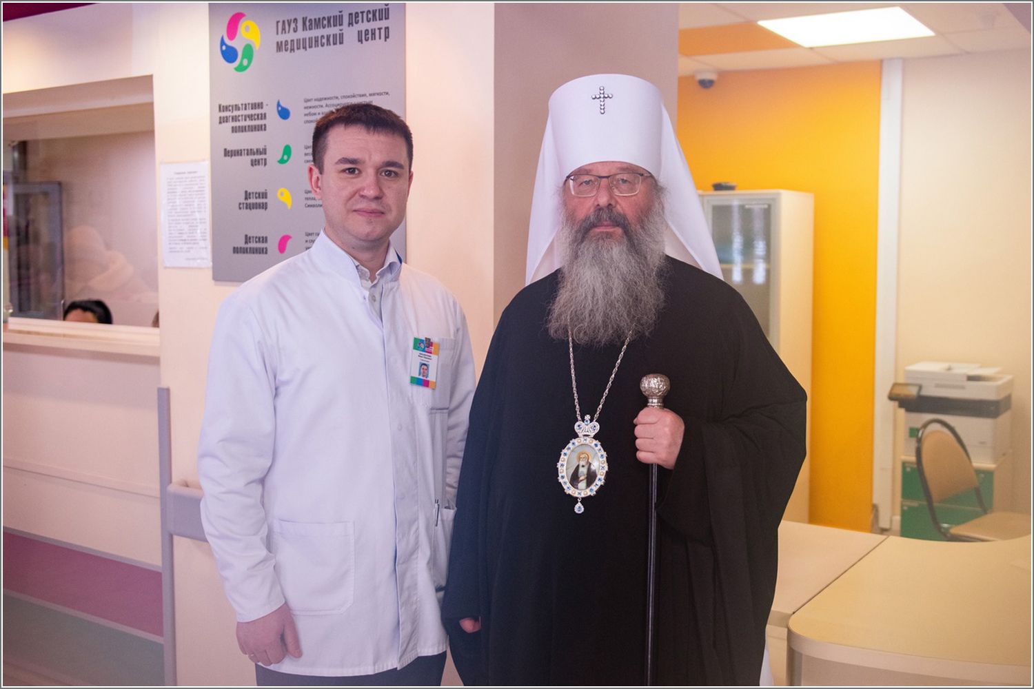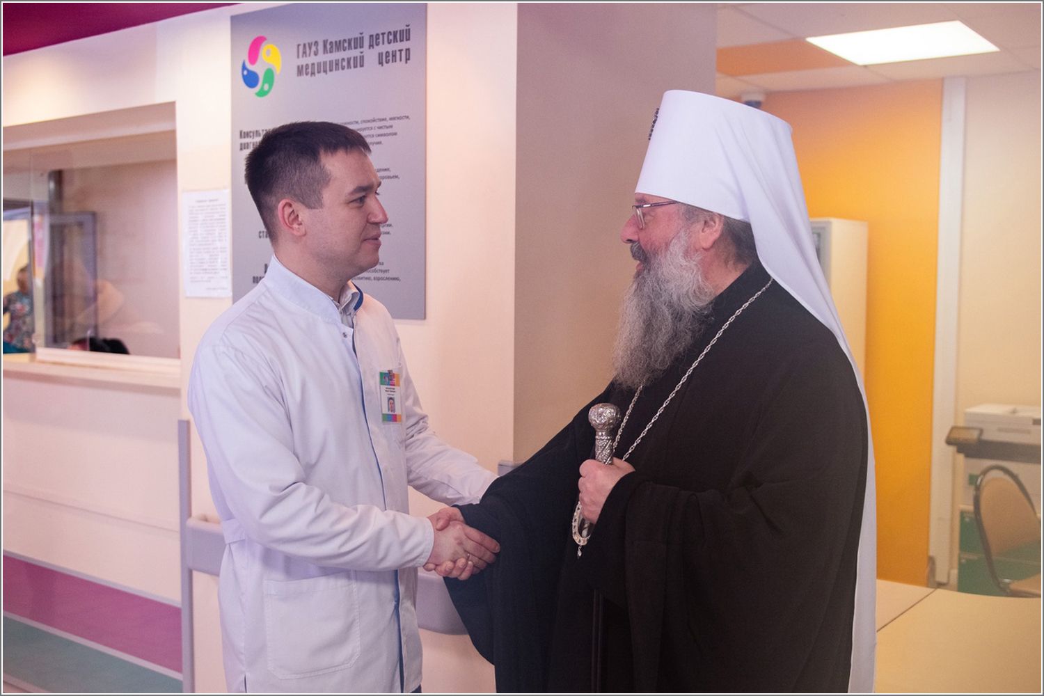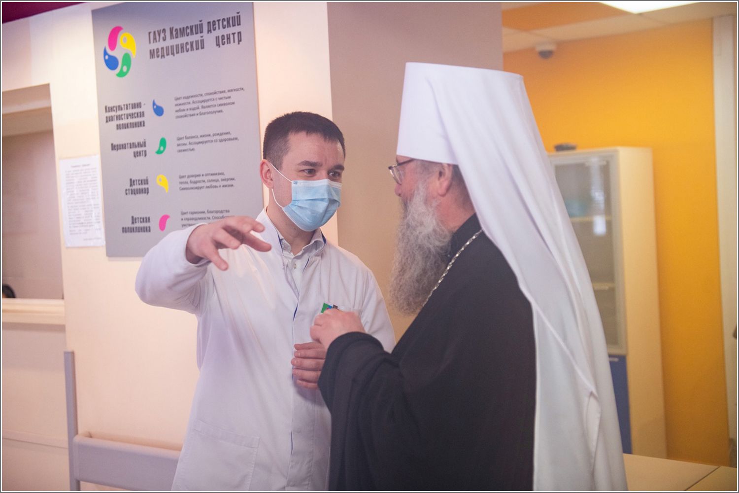 Главу Татарстанской митрополии приветствовал главный врач ГАУЗ «Камский детский медицинский центр» Марат Насыбуллин. Он познакомил Его Высокопреосвященство с руководящим персоналом медучреждения и рассказал о работе медицинского центра. М. Насыбуллин сообщил о планируемом создании в больнице молельной комнаты.
