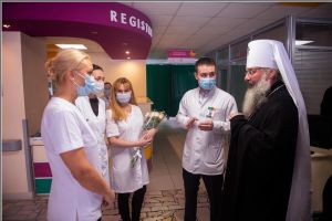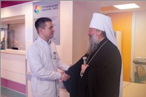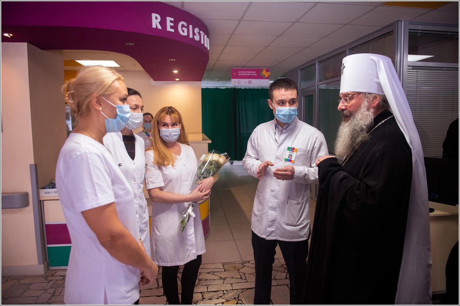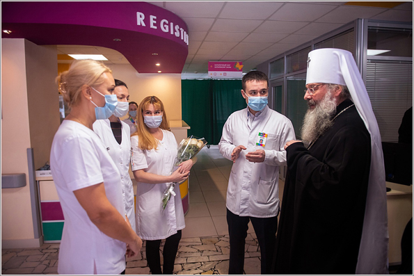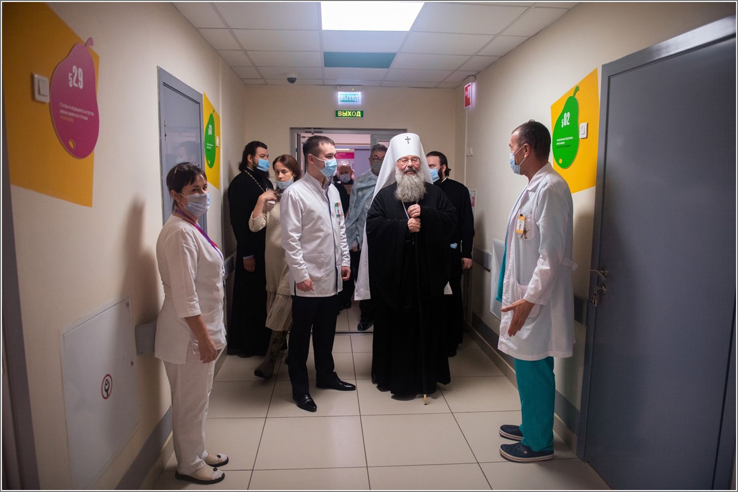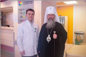 Главу Татарстанской митрополии приветствовал главный врач ГАУЗ «Камский детский медицинский центр» Марат Насыбуллин. Он познакомил Его Высокопреосвященство с руководящим персоналом медучреждения и рассказал о работе медицинского центра. М. Насыбуллин сообщил о планируемом создании в больнице молельной комнаты.