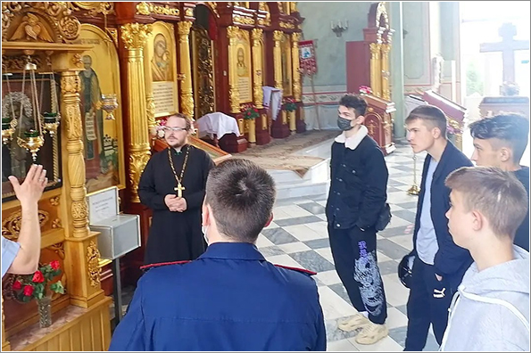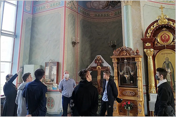 Экскурсию и беседу провел клирик храма иерей Александр Макариков. Батюшка рассказал про роспись храма, об образах и иконах, о святых Церкви Христовой, о Священном Писании.