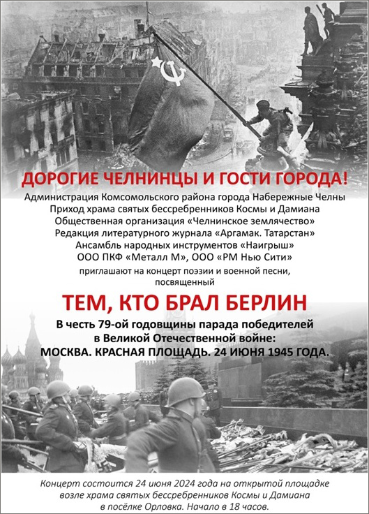 Приглашаем вас на концерт поэзии и военной песни «ТЕМ, КТО БРАЛ БЕРЛИН» в честь 79-ой годовщины Парада победителей в Великой Отечественной войне в Москве, на Красной площади 24 июня 1945 года.