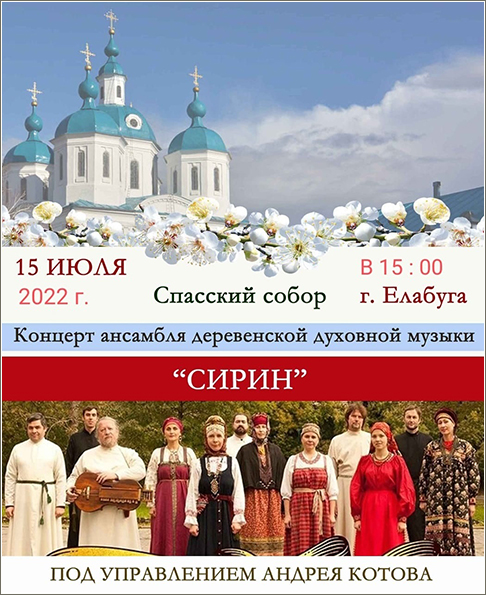 15 июля в 15.00 в Спасском соборе города Елабуги выступит всемирно известный ансамбль древнерусской духовной музыки «Сирин». Ансамбль неоднократно приезжал в Елабугу в рамках фестиваля «Летние вечера в Елабуге». В этом году фестиваль проходит с 14 по 17 июля.