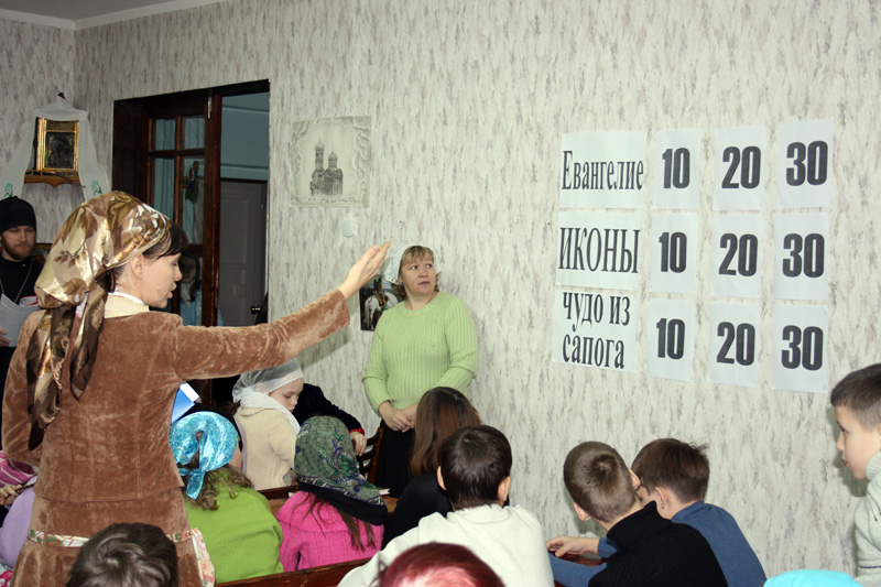 Но вот вышли ведущие – педагог воскресной школы собора Волкова Ольга Леонидовна и клирик храма в честь святого преподобного Серафима Саровского иерей Михаил Санаров. Они объяснили ход предстоящей игры: на стене висят листы, на которых написаны названия разделов с вопросами «Евангелие», «Иконы» и «Чудо из сапога». В каждом разделе находятся задания на 10,20 и 30 баллов. В разделе «Евангелие» подготовлены вопросы на тему праздника Рождества Христова, в «Иконах» спрятались вопросы об образах, которые ребятам не только следовало правильно отгадать, но и рассказать, что изображено на них. Раздел «Чудо из сапога» был наиболее интересным и, наверно, самым сложным. Командиру показывали «сюрприз», спрятанный в мешочке. Команда должна была задавать вопросы, на которые можно дать ответы «да» или «нет», и догадаться, какой предмет, связанный с праздником, лежит в сапоге.
