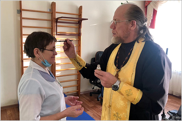 Отец Рафаил совершил молебен о здравии присутствующих и помазал святым маслом, освященном на мощах преподобного Серафима Саровского. Масло было выбрано не случайно. Великий Российский чудотворец и сам в земной жизни получил серьезные телесные увечья от рук разбойников, но несмотря на это, помогал и помогает, после отшествия в Небесные обители, людям, страждущим телесными и духовными заболеваниями. По договоренности, каждый из присутствующих, кто желал помазания, называли вслух свои имена, и отец Рафаил помазывал крестообразно святым елеем. С улыбками и искорками радости в глазах произносили собравшиеся имена. Кто-то легко, кто-то с определенной долей усилия, по причине того, что речь даётся не просто, но с неменьшей радостью.