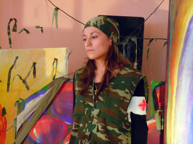 Основное сценическое действие происходило на военном поле, каждый, даже звукорежиссер, был облачен в военные костюм, здесь можно было узнать и санитаров, и военных писателей. Но как многие зрители правильно заметили, война была представлена не как обычное боевое действие. Это война духовная – дилемма, нелегкая борьба, происходящая в сердце каждого человека между добром и злом. Серафим Саровский выбрал добро, выбрал Бога, и уже с юных лет отличался большой тягой к духовной жизни, совершая затем в жизни множество подвигов. Особо в постановке было подчеркнуто его пребывание в «радостном духе», которое преподобный Серафим противопоставлял духу уныния, печали. Зрители сами могли поучаствовать в постановке, исполняя вместе с труппой песни «Батюшка Серафим», «Радость моя».