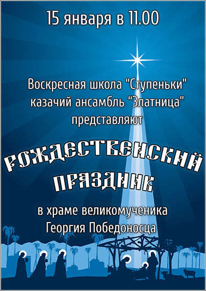 15 января в Георгиевском храме города Набережные Челны пройдет Рождественский праздник воскресной школы прихода, который начнется по окончании воскресного богослужения в храме. В празднике примет участие казачий ансамбль «Златница».