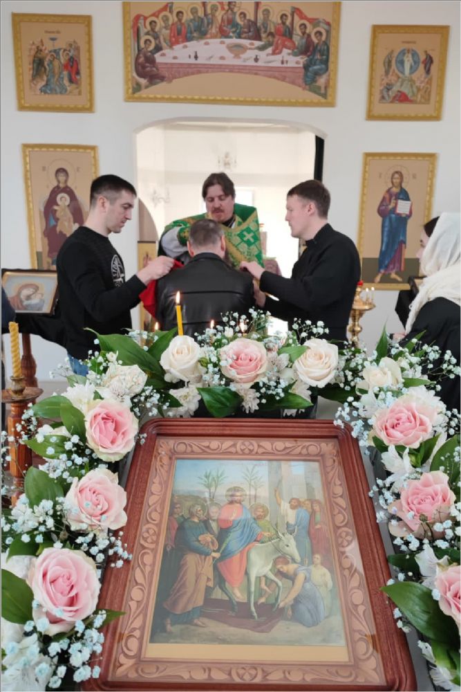 9 апреля в казачьем Крестовоздвиженском храме города Набережные Челны прошла служба Входа Господня в Иерусалим, которую совершил настоятель протоиерей Сергий Писковцев. Казаки подразделения Боровецкого хутора, ответственные за охрану общественного порядка в казачьем храме, приняли молитвенное участие в праздничном богослужении, в том числе и в алтарном послушании.
