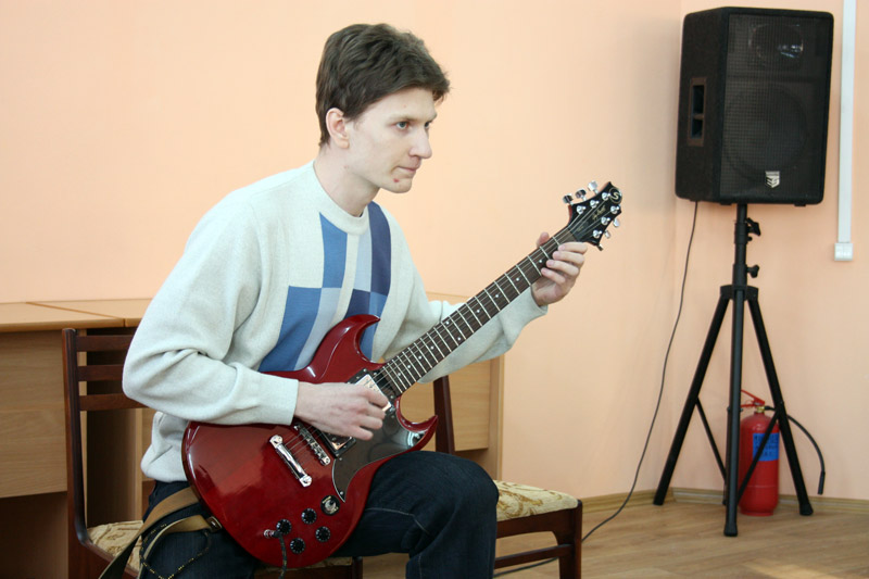 Преподаватель игры на гитаре Денис Белов представил зрителям инструментальную композицию из репертуара группы «Led Zeppelin» «Лестница в небеса» – знаменитая баллада о девушке, которая мечтала купить лестницу до самого неба.
