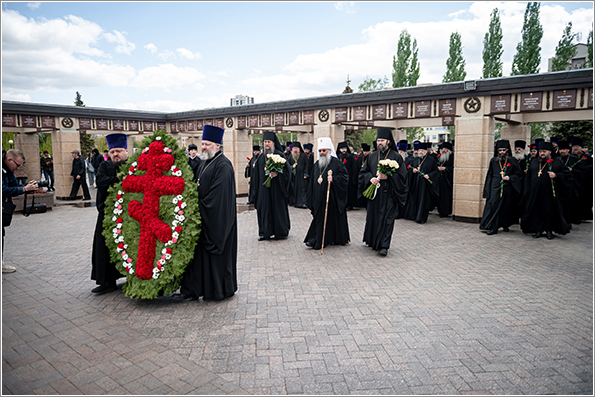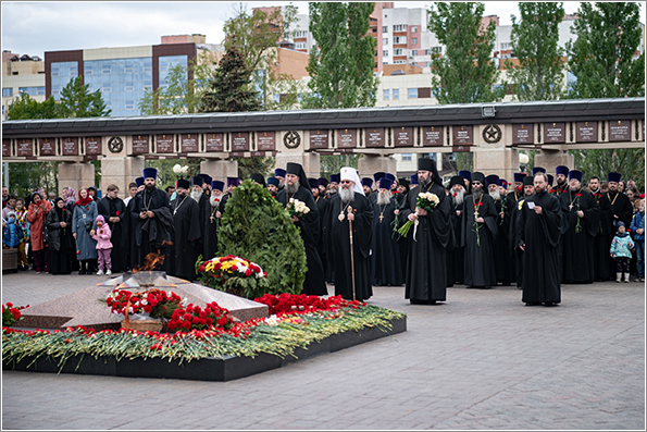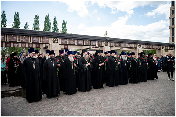 Возлагая цветы к мемориалу, вспомним тех, кто сегодня стоит на страже интересов нашей Родины, о тех, кто каждое мгновение рискует своей жизнью. Мы должны всегда их помнить и молиться о них сугубо. А герои Великой Отечественной войны — мученики. Мы чувствуем их щит, их молитвенный покров над каждым из нас. Царство им Небесное и вечный покой со святыми.
