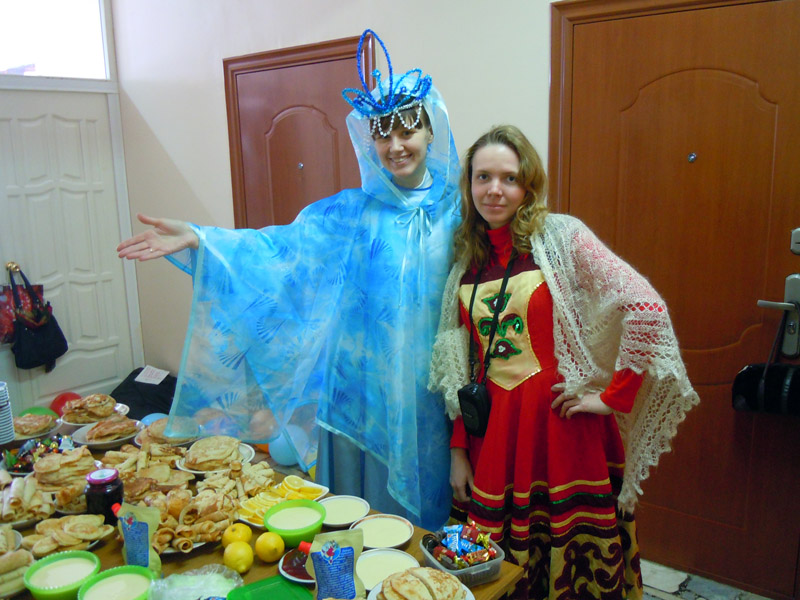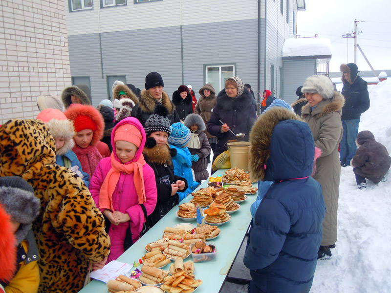 По окончании игр для детей прямо на улице были накрыты столы, которые ломились от разнообразных угощений: блинов со сгущенкой, печенья, варенья, яблок…