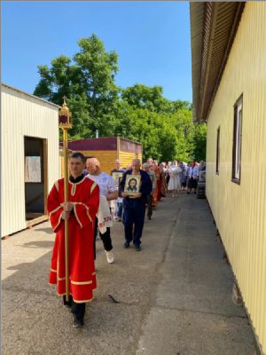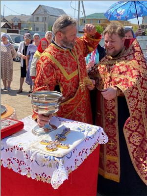 Настоятель прихода иерей Александр Ворошилов обильно окропил прихожан святой водой. Разделить радость праздника пришел клирик Свято-Вознесенского архиерейского подворья диакон Виталий Семенов.