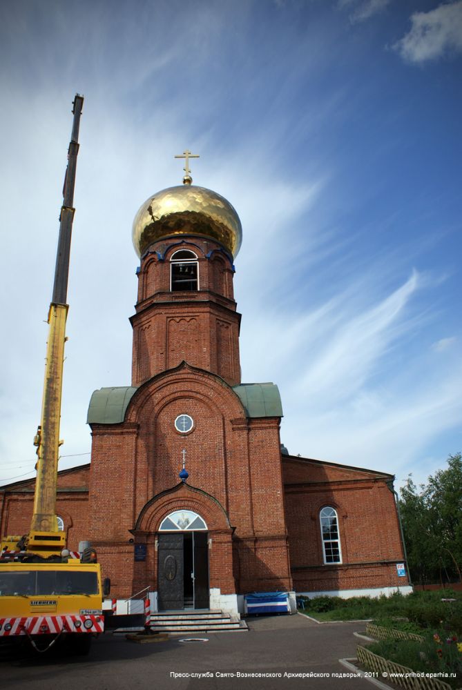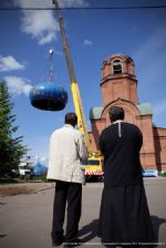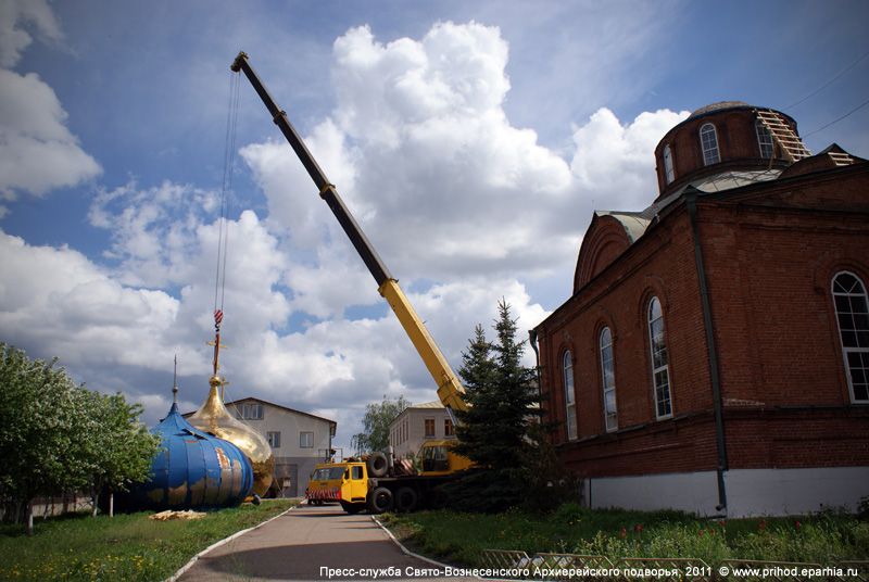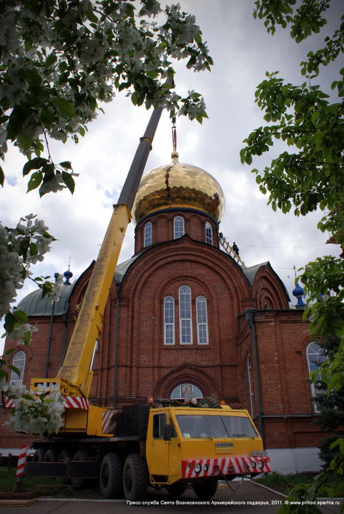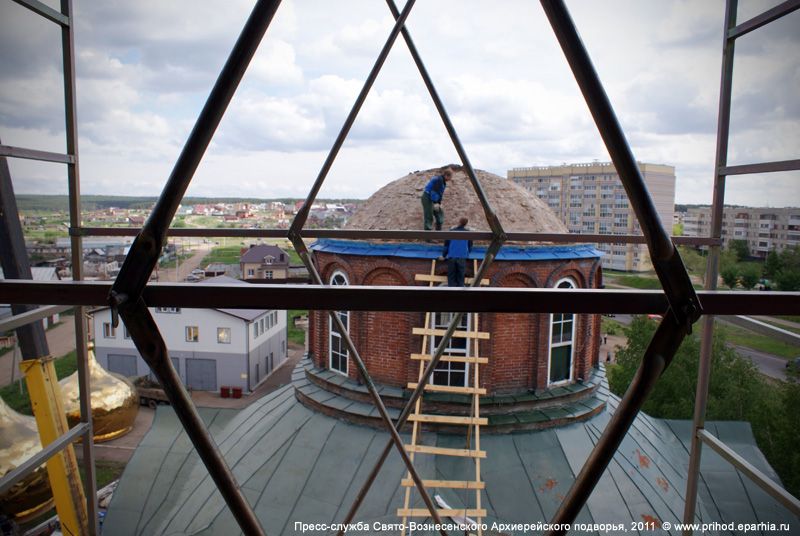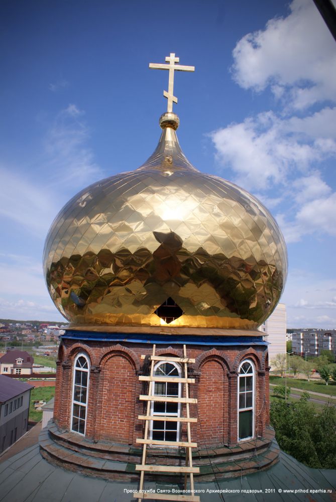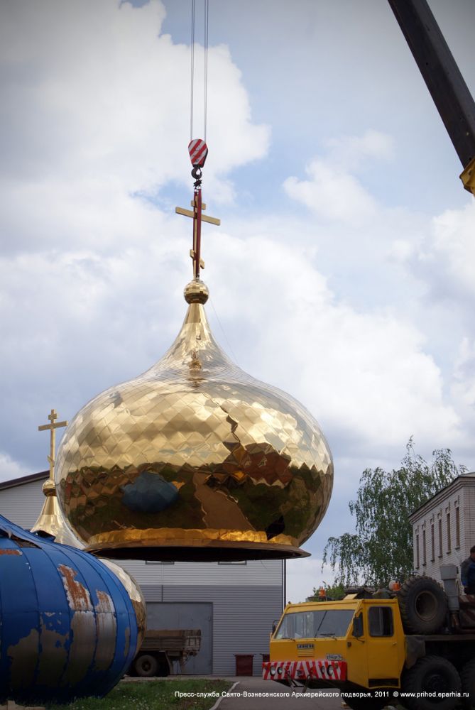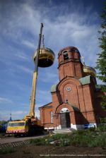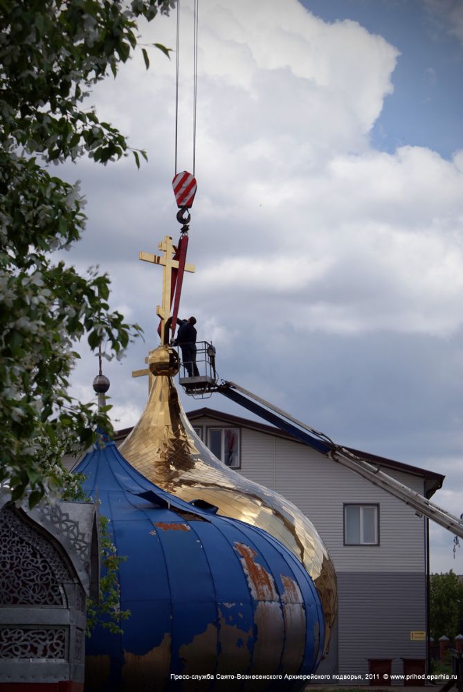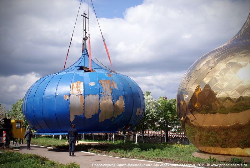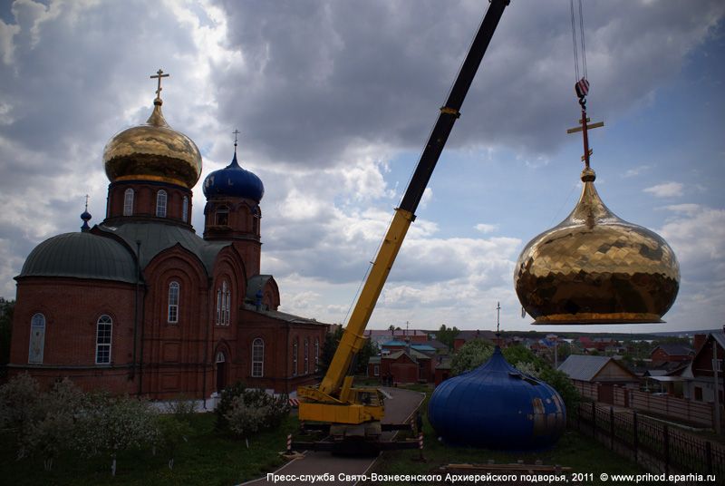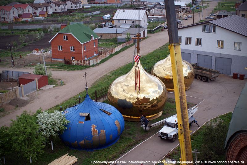 Набережные Челны, 25 мая — Православное Закамье, Юлия Кокорина. На здании Свято-Вознесенского собора закончены работы по реконструкции куполов. 28 мая старые купола были заменены на новые. Работы производились с 9 утра до 17 часов вечера. Перед началом монтажа настоятель собора протоиерей Андрей Дубровин отслужил молебен на всякое благое дело.