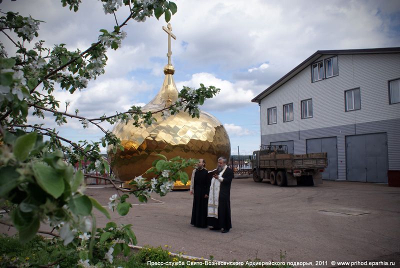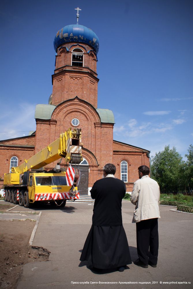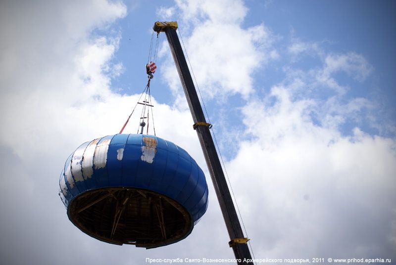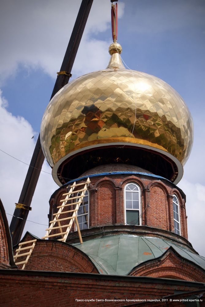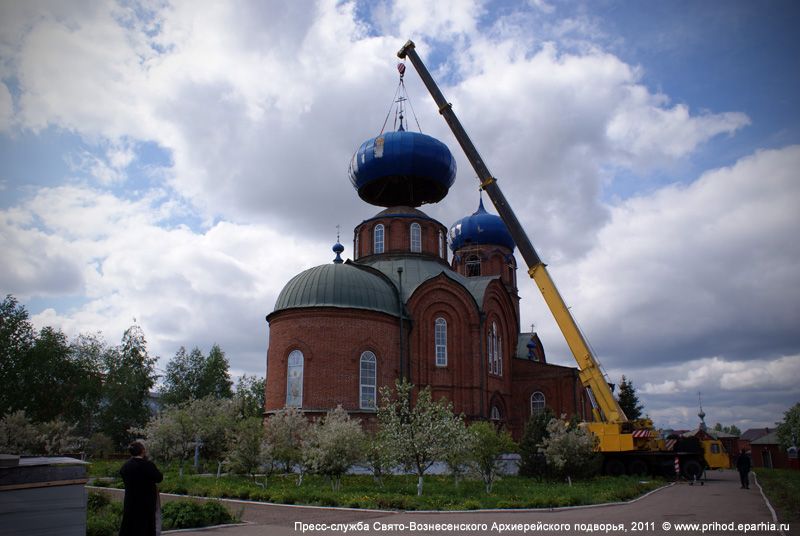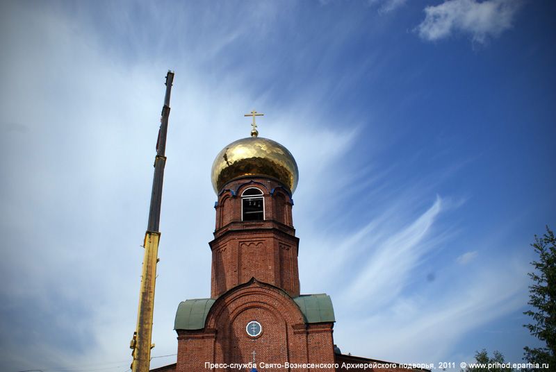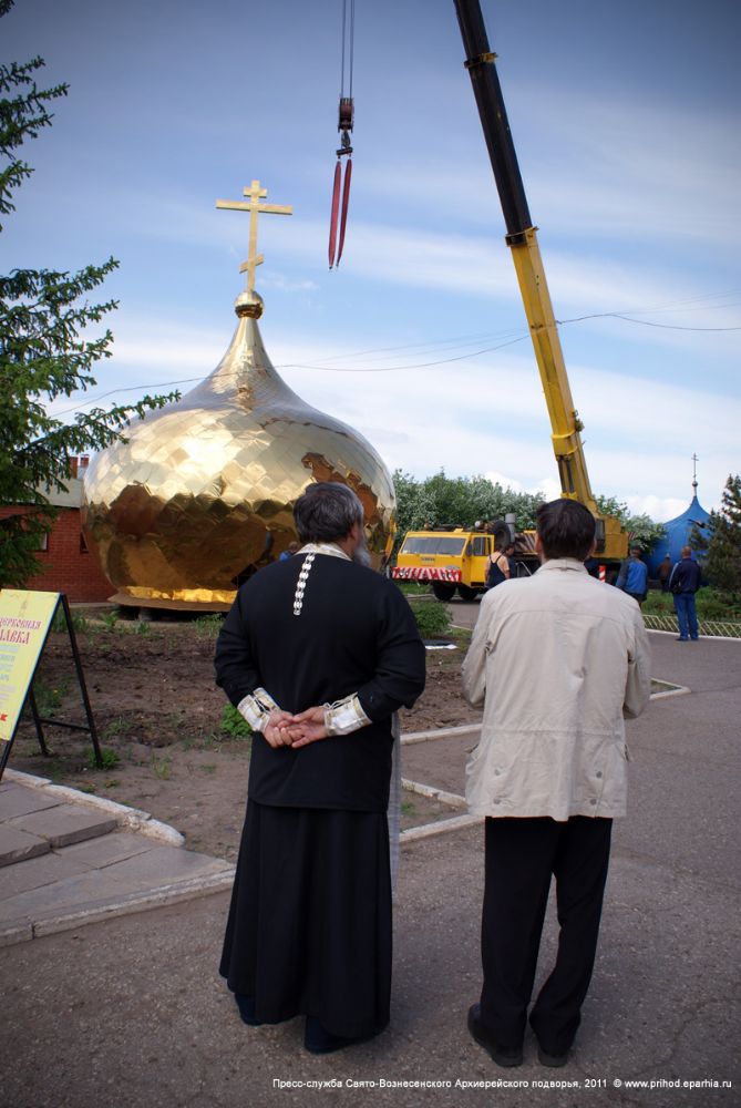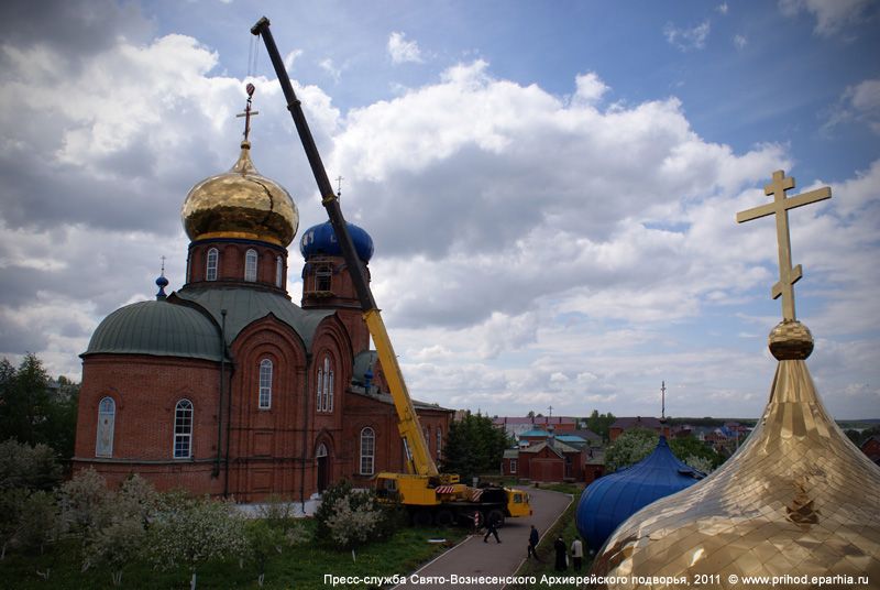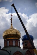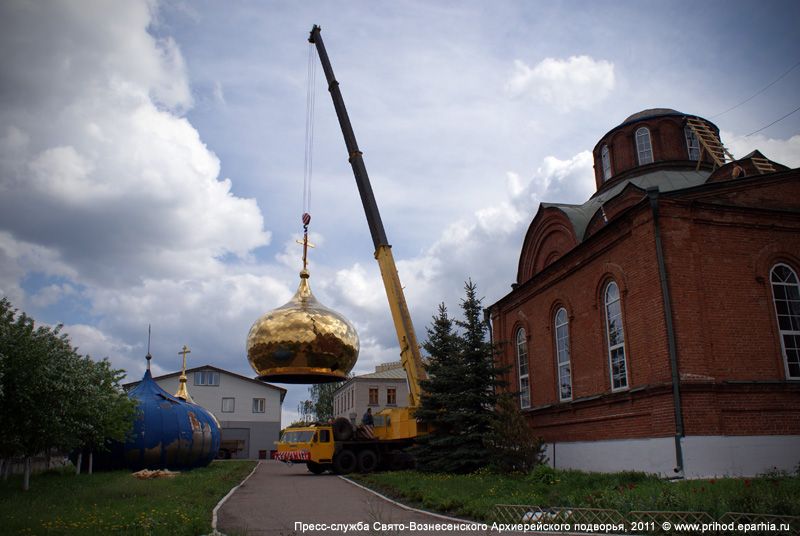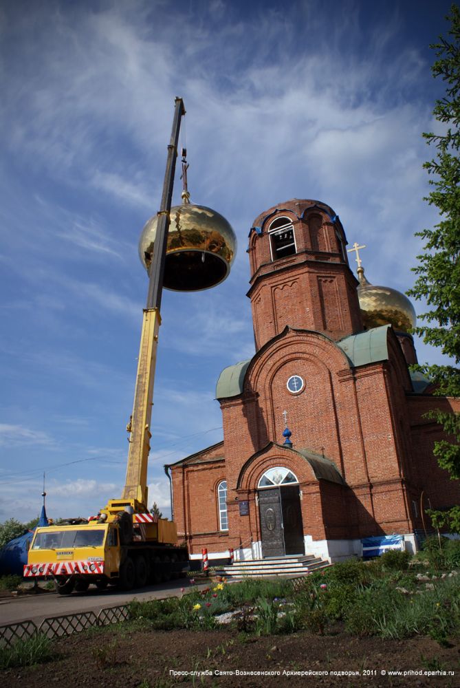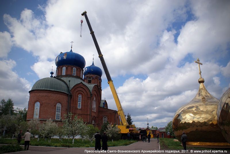 Набережные Челны, 25 мая — Православное Закамье, Юлия Кокорина. На здании Свято-Вознесенского собора закончены работы по реконструкции куполов. 28 мая старые купола были заменены на новые. Работы производились с 9 утра до 17 часов вечера. Перед началом монтажа настоятель собора протоиерей Андрей Дубровин отслужил молебен на всякое благое дело.