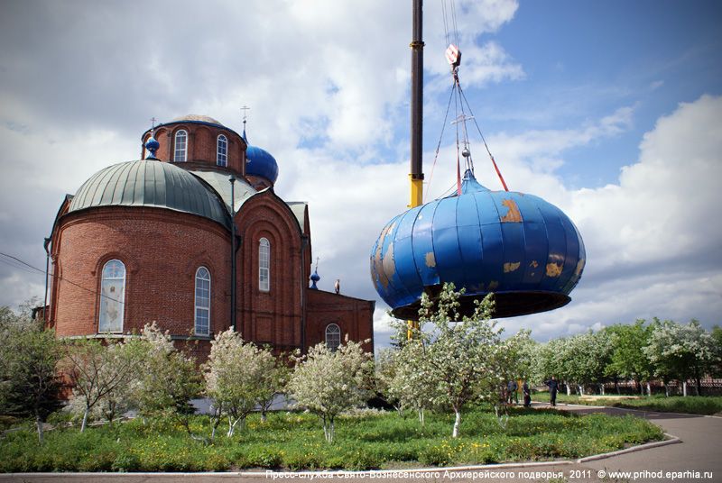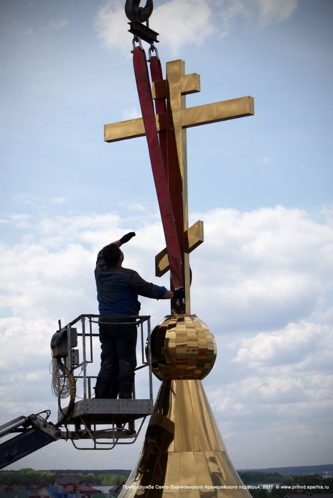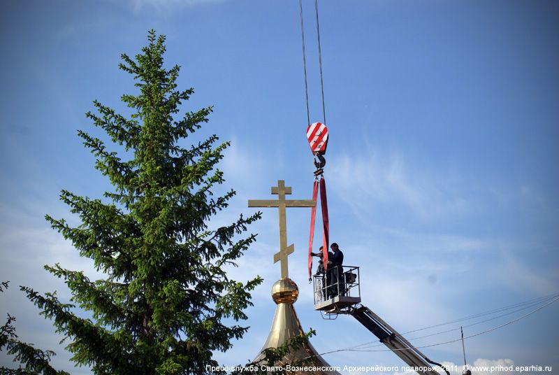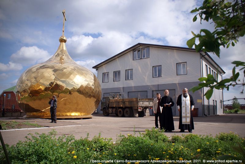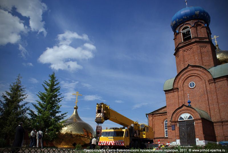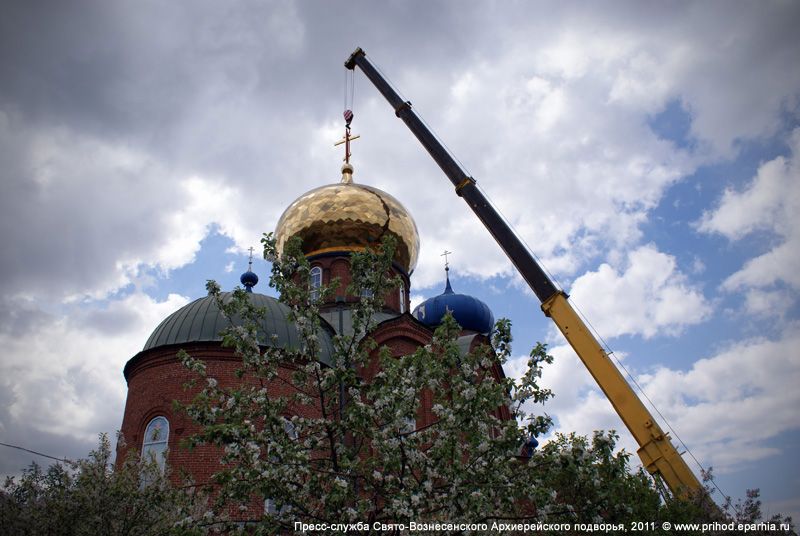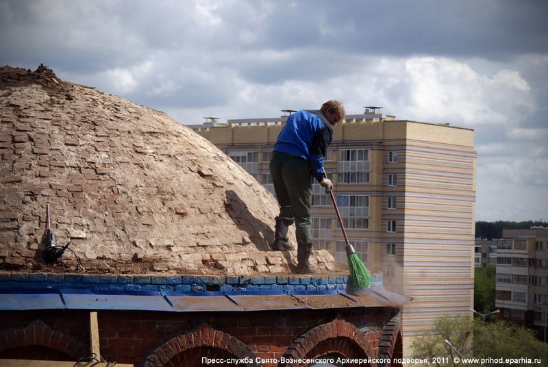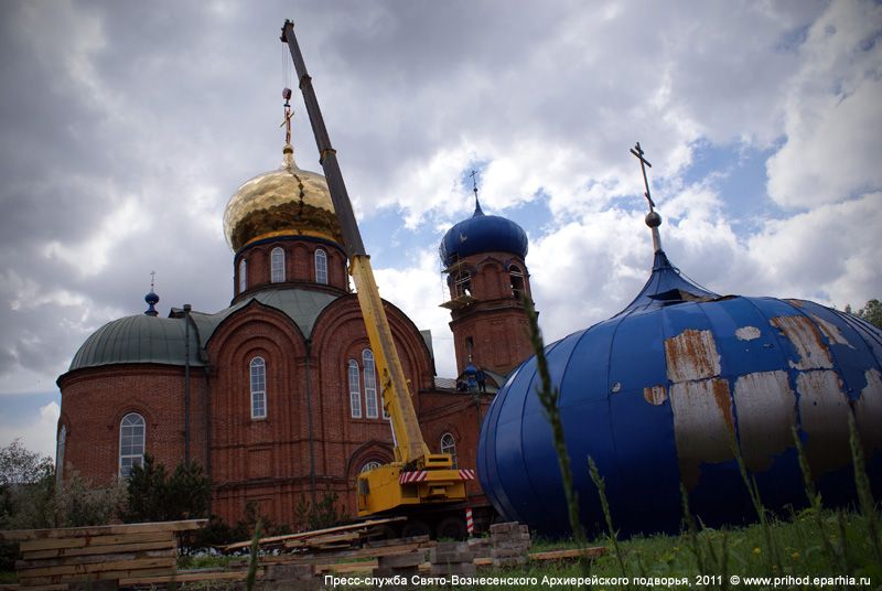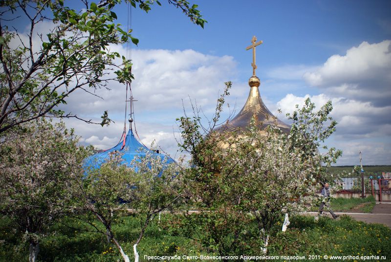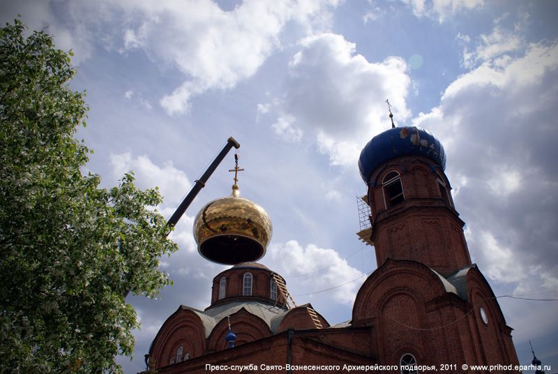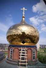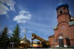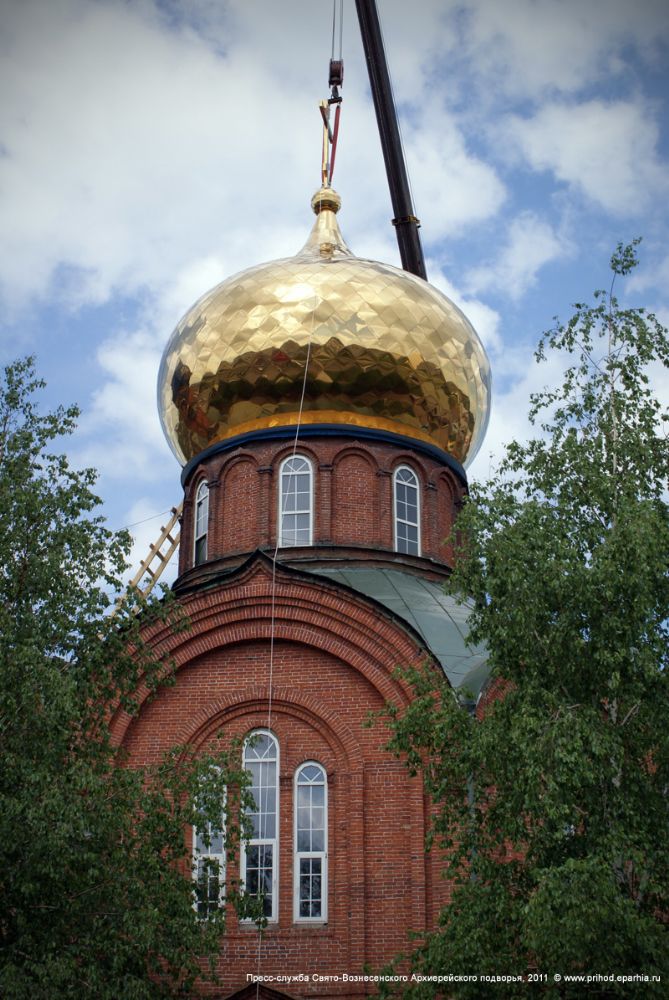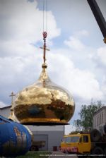 Набережные Челны, 25 мая — Православное Закамье, Юлия Кокорина. На здании Свято-Вознесенского собора закончены работы по реконструкции куполов. 28 мая старые купола были заменены на новые. Работы производились с 9 утра до 17 часов вечера. Перед началом монтажа настоятель собора протоиерей Андрей Дубровин отслужил молебен на всякое благое дело.