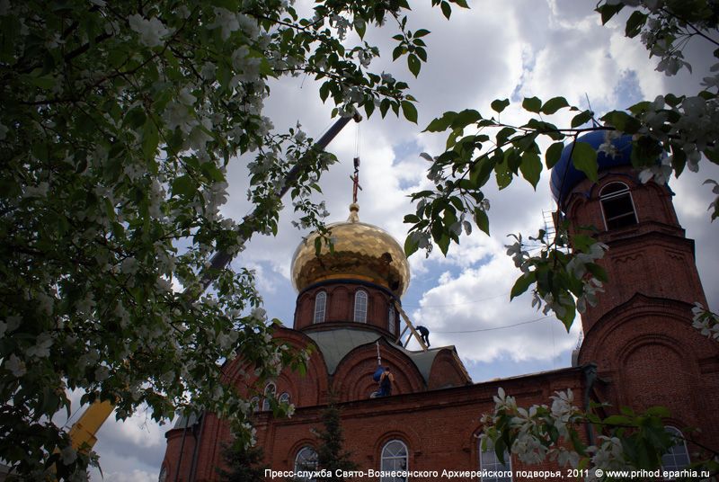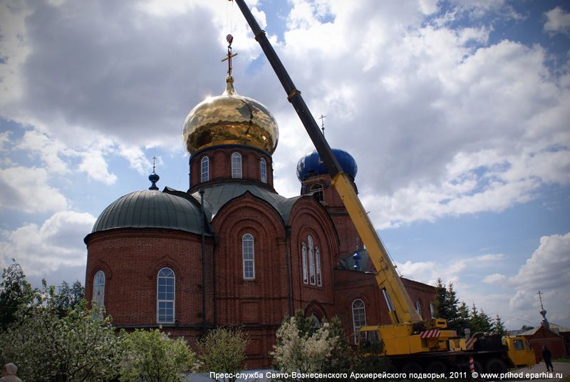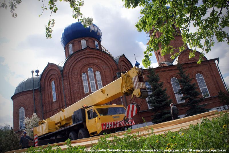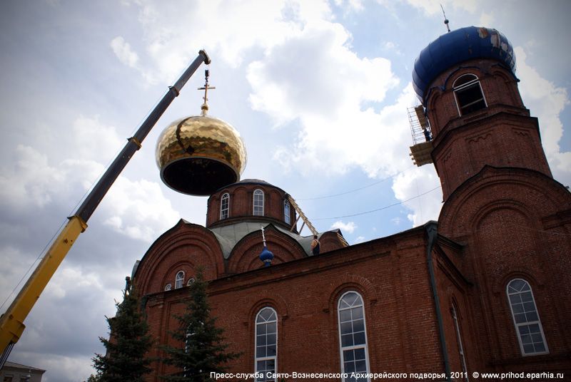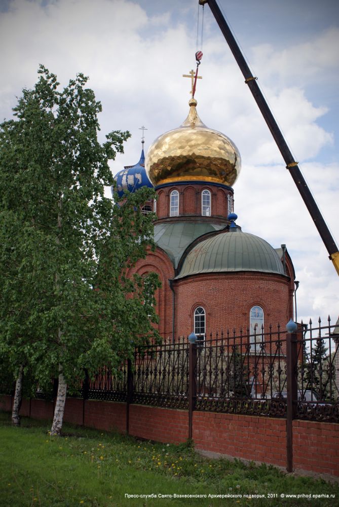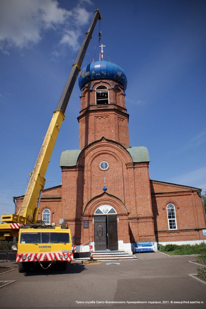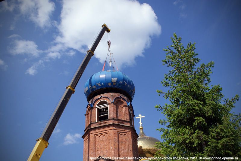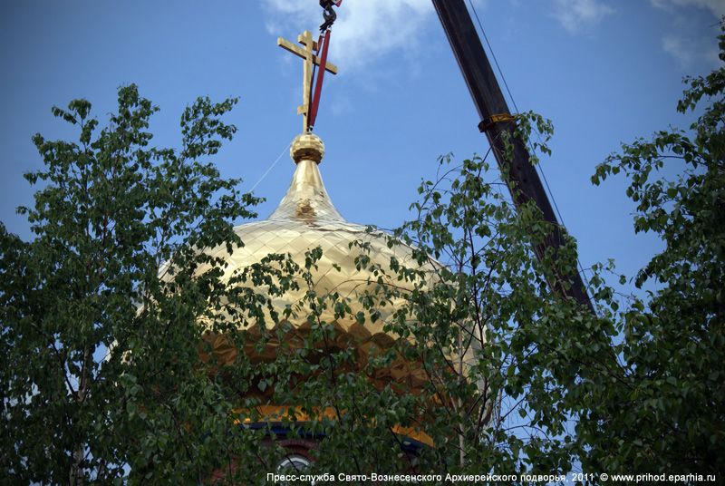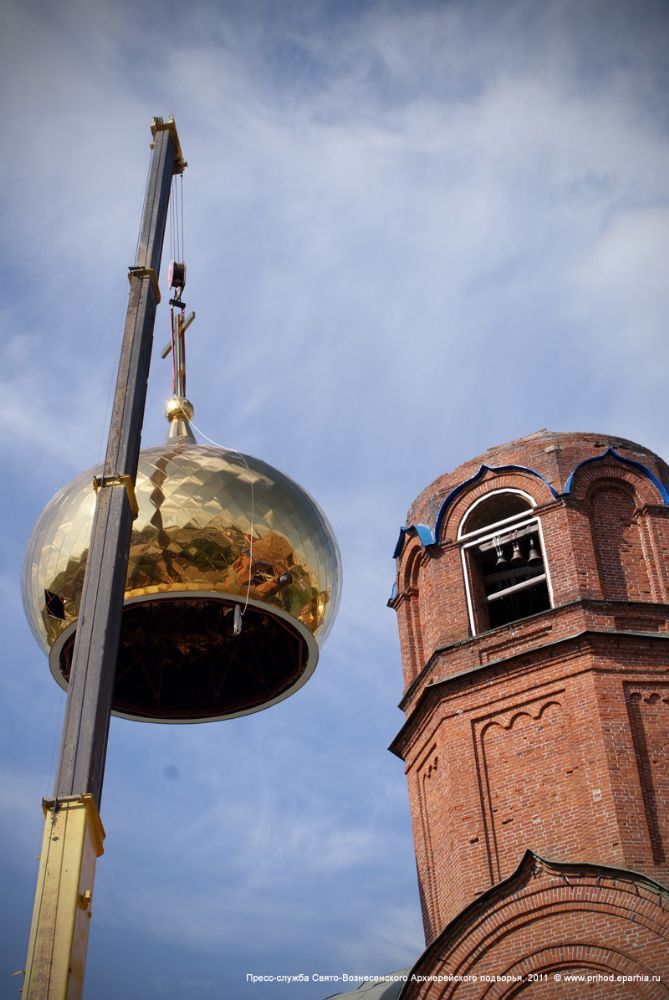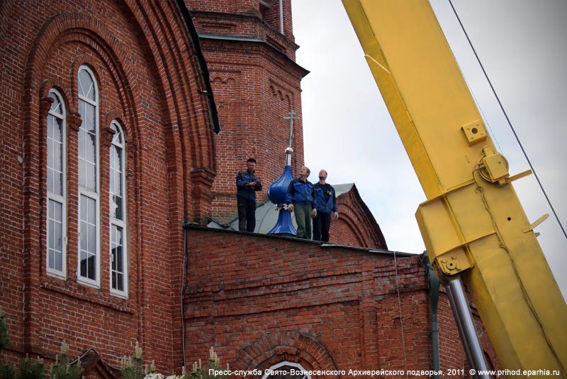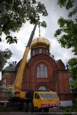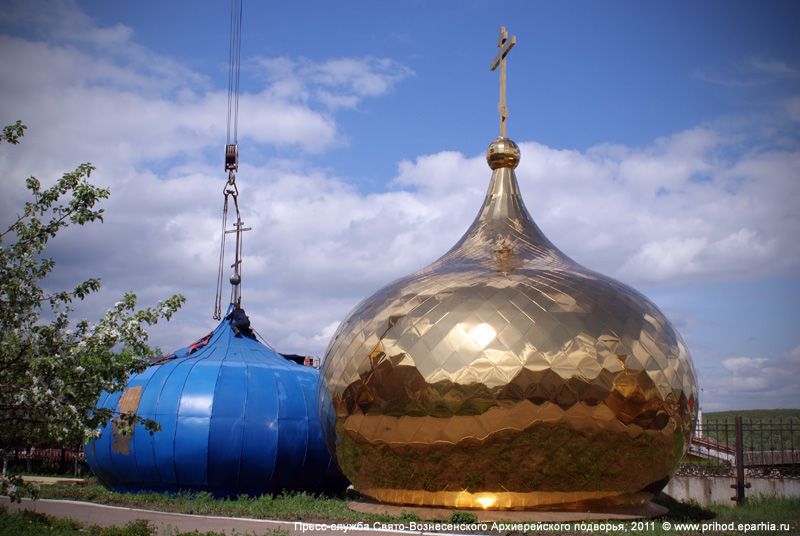 Набережные Челны, 25 мая — Православное Закамье, Юлия Кокорина. На здании Свято-Вознесенского собора закончены работы по реконструкции куполов. 28 мая старые купола были заменены на новые. Работы производились с 9 утра до 17 часов вечера. Перед началом монтажа настоятель собора протоиерей Андрей Дубровин отслужил молебен на всякое благое дело.