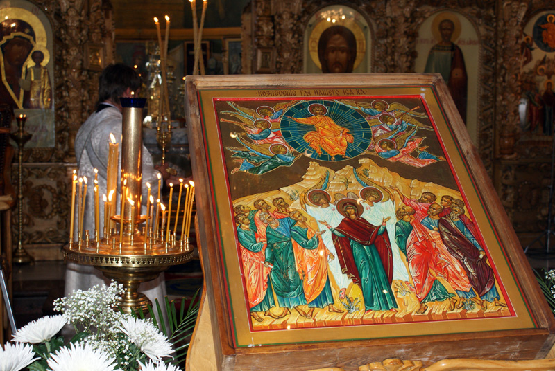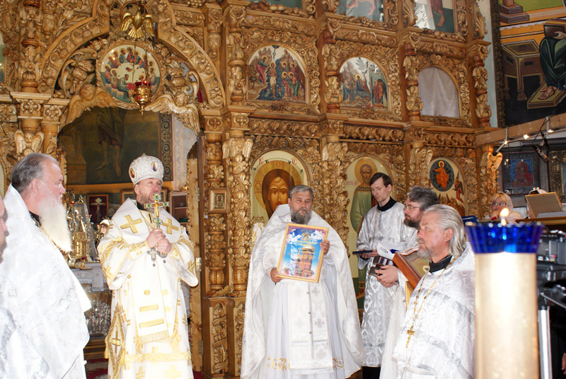 В честь праздника Вознесения Господня настоятель Свято-Вознесенского Архиерейского подворья протоиерей Андрей Дубровин преподнес в подарок архиепископу Анастасию икону свт. Николая Чудотворца и букет цветов.