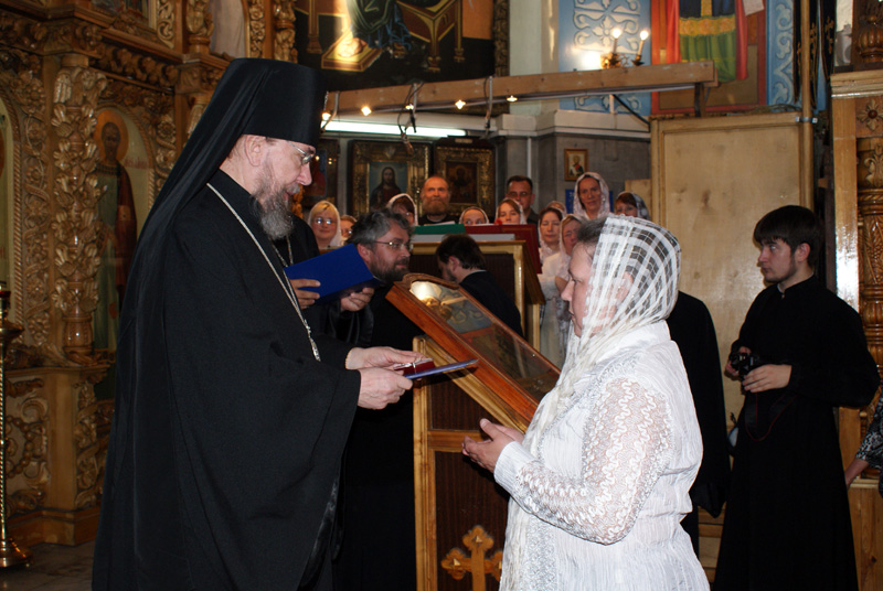 В завершение престольного богослужения Владыка поблагодарил настоятеля собора и всех, кто пожертвовал средства на реконструкцию куполов, и вручил памятные подарки, архиерейские грамоты и знаки отличия наиболее активным меценатам и трудникам храма.