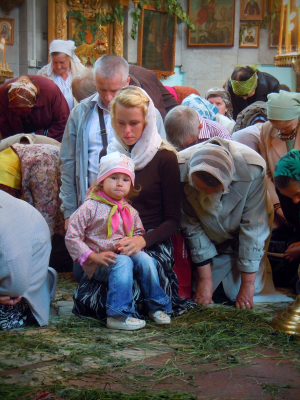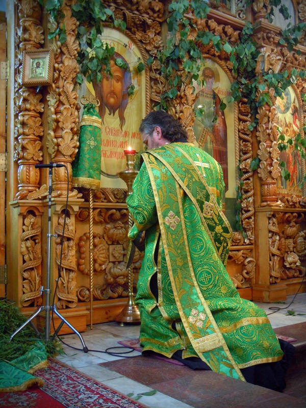 После литургии прошла великая вечерня, на которой пелись стихиры, прославляющие сошествие Святого Духа, и читались три специальных молитвы о Церкви, о спасении всех молящихся и о упокоении душ всех усопших. Во время чтения этих молитв все молящиеся стояли на коленях, этим завершился послепасхальный период, во время которого в храмах не совершались коленопреклонения и земные поклоны.
