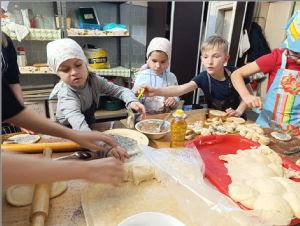 31 октября воспитанники Клуба помогали работникам трапезной печь булочки. Дети принесли корицу, мак, кунжут, кокосовую стружку, шоколадные крошки, надели фартуки и косынки, помолились, педагог Ольга Желтоножко объяснила ход действий, и работа закипела.