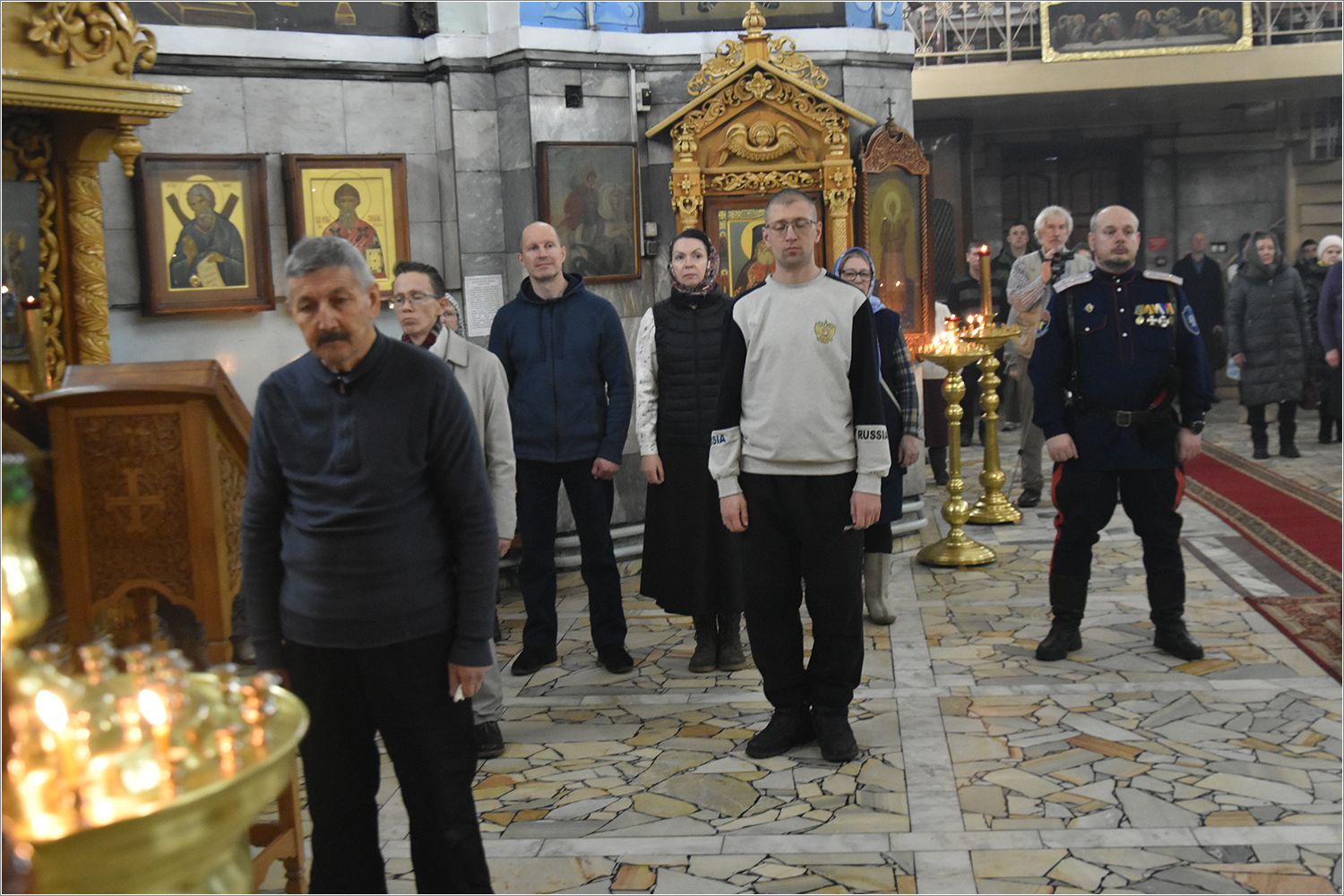 На мирной и сугубой ектениях были вознесены молитвы о Российском воинстве и о мире. По запричастном стихе проповедь произнёс протоиерей Андрей Лосык.