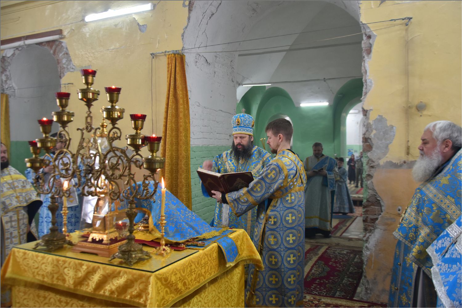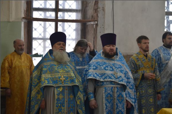 Архипастырю сослужили благочинный Елабужского округа иеромонах Кирилл (Забавнов), благочинный Закамского региона протоиерей Андрей Дубровин, настоятель елабужского Покровского собора иерей Симеон Лепихин, настоятель Покровского храма села Тарловка священноинок Кирилл (Власов), настоятель храма Трех святителей села Ижевка иерей Александр Миронов, клирик Спасского собора Елабуги иерей Михаил Климов. Диаконский чин возглавил протодиакон Дмитрий Половников. Богослужебные песнопения исполнил смешанный хор собора под управлением Натальи Кучерявенко.
