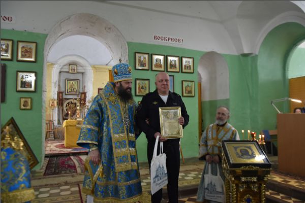После Божественной Литургии архипастырь особо поблагодарил начальника Елабужского суворовского училища полковника внутренней службы Павла Валова за большой вклад, который тот внес в дело сохранения и передачи Никольского храма в лоно Русской Православной Церкви: