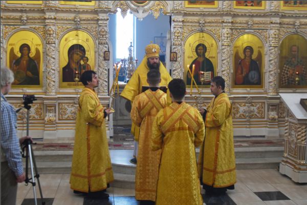 Его Преосвященству сослужили благочинный Закамского церковного округа протоиерей Андрей Дубровин, ключарь храма Казанской иконы Божией Матери г. Набережные Челны иерей Дмитрий Веретнов, клирик прихода иерей Алексий Носов, протодиакон Дмитрий Половников и диакон Михаил Карпухин. Песнопения богослужения исполнил смешанный приходской хор под руководством Елены Головных.