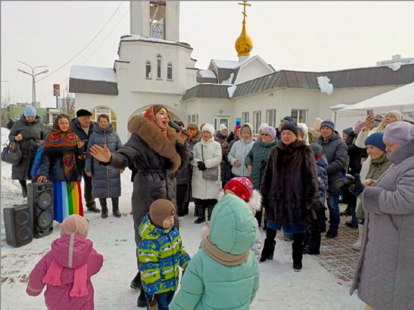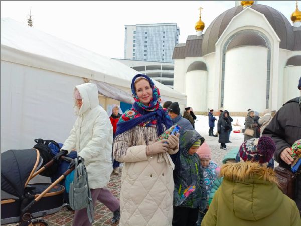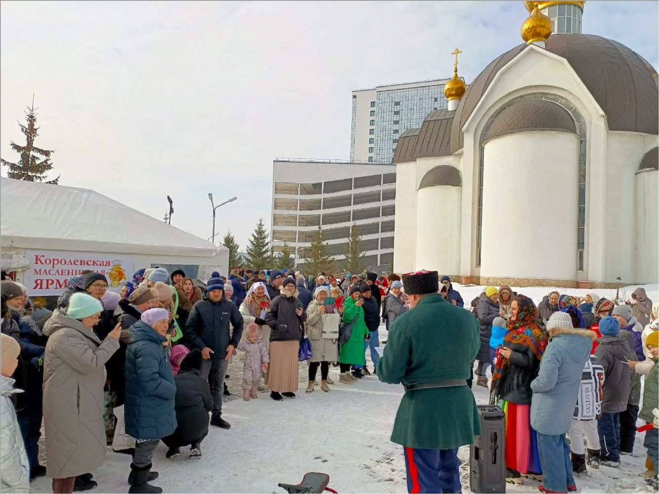 После Божественной литургии на территории храма прошла Королевская масленичная ярмарка. Народные песни под гармонь, показательные выступления казаков по рубке и фланкировке шашкой, блины и пироги — все это было для прихожан и гостей храма.