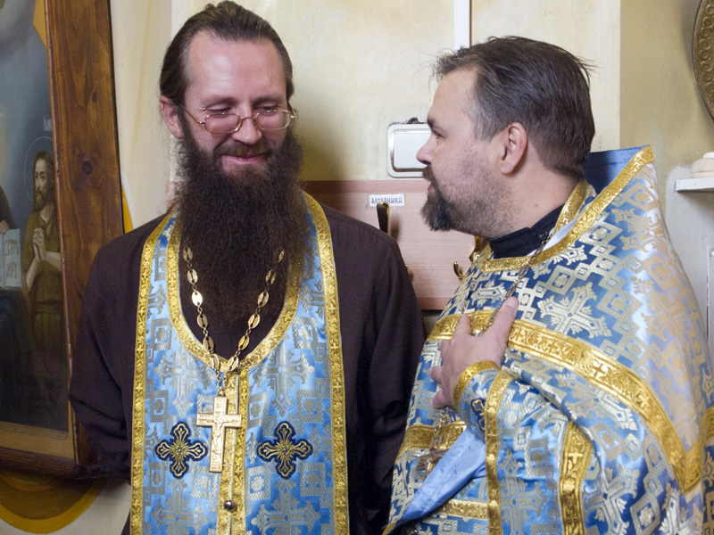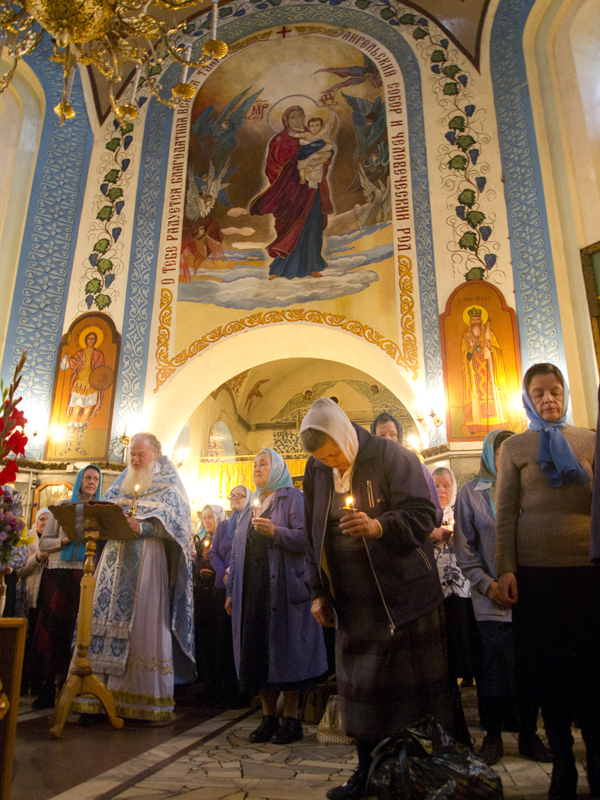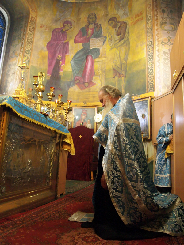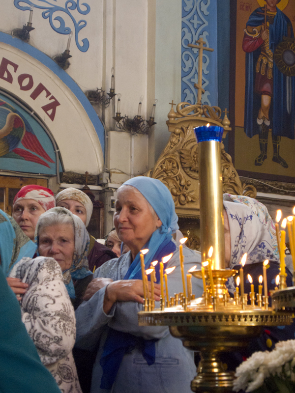 Храм пестрел в эти дни женскими платочками цвета небесной лазури, сине-золотистое облачение духовенства подчеркивало величие небесного предстательства Пресвятой Богородицы за нас грешных пред Господом нашим Иисусом Христом. По обыкновению большинство верующих составляли женщины, пришедшие с любовью и смирением испросить благ земных и небесных для своих близких, как и Богородица – заботливая Матерь всех христиан – непрестанно молит Сына своего за усыновленное Ей человечество.