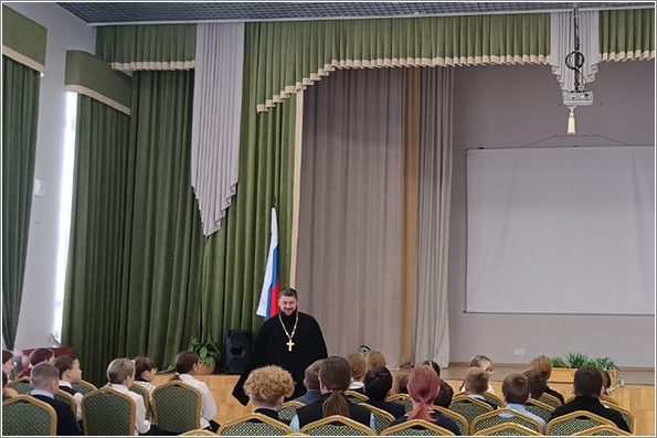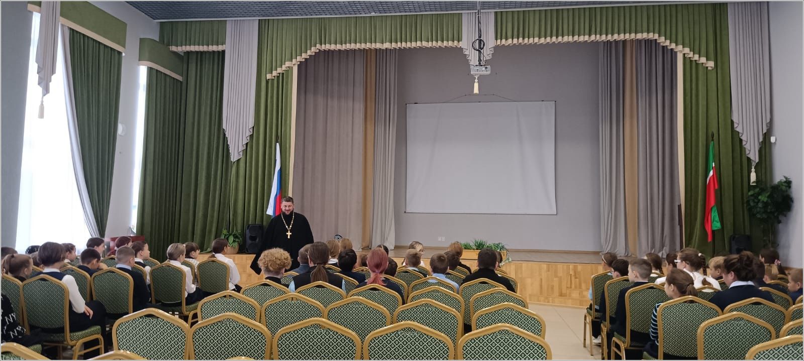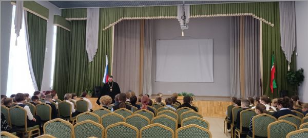 25 сентября в СОШ №1 города Мензелинска прошла необычная встреча. На урок пришел настоятель Никольского собора иерей Роман Храмутичев. Батюшка постарался преподнести сложные вопросы духовной жизни понятно и интересно.