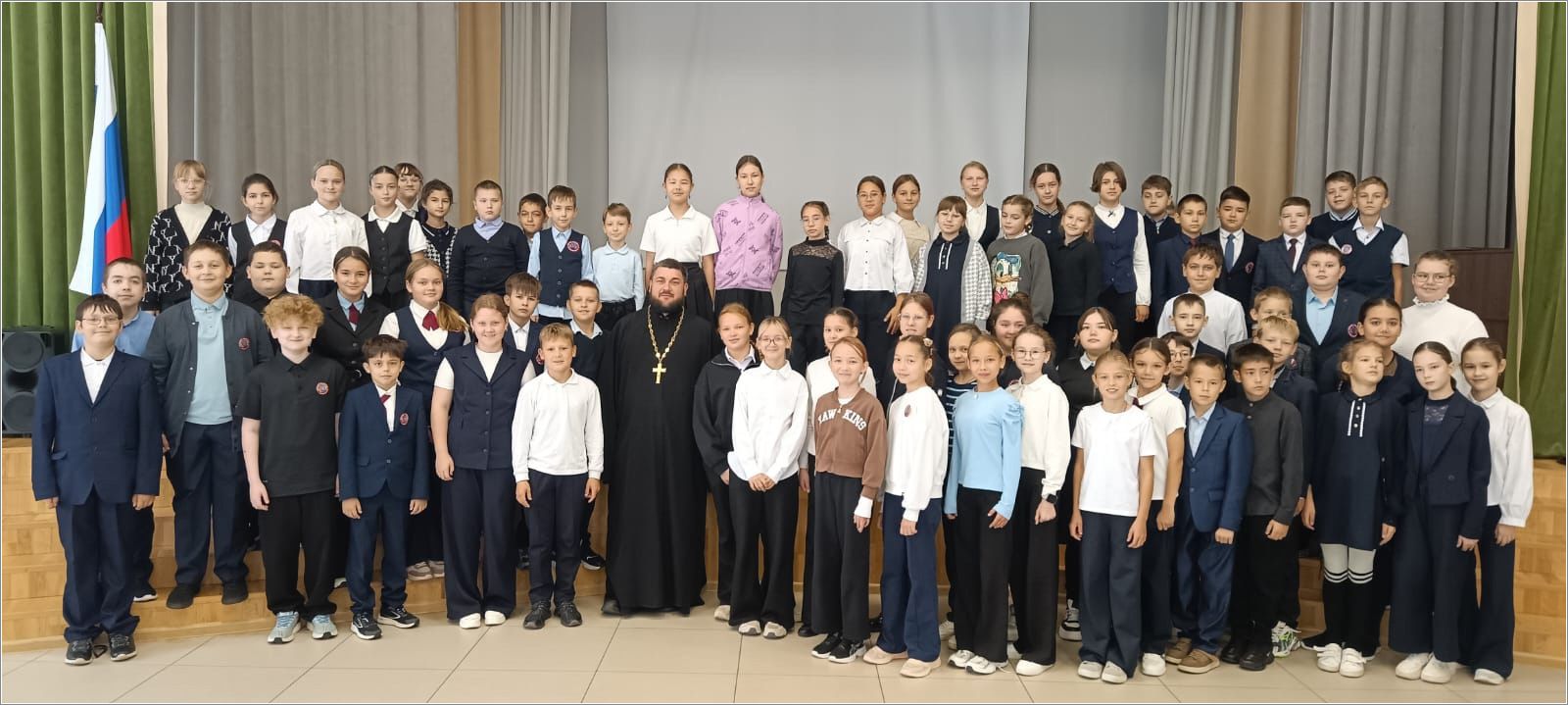 Беседа, в которой приняли участие пятые классы вместе с классными руководителями, была посвящена понятиям добра и зла, греху с православной точки зрения и его влиянии на душу человека. Кроме этого, священнослужитель сделал акцент на главной заповеди — «Возлюби ближнего своего как самого себя» и поведал детям, почему надо делать дела любви, помогать тем, кто рядом и нуждается в поддержке: родителям, учителям, одноклассникам, соседям. Школьники смогли узнать, как грех уводит от Бога, откуда он пришел в этот мир и как с ним можно бороться. Отец Роман напомнил, что нательный крестик, который носит каждый христианин с крещения, ежедневно напоминает о присутствии Божьем и что необходимо благодарить Создателя за все Его блага — видимые и невидимые.