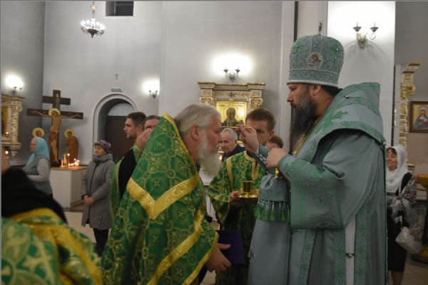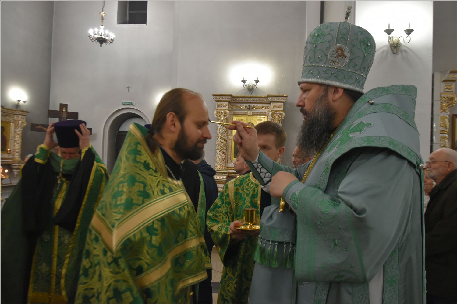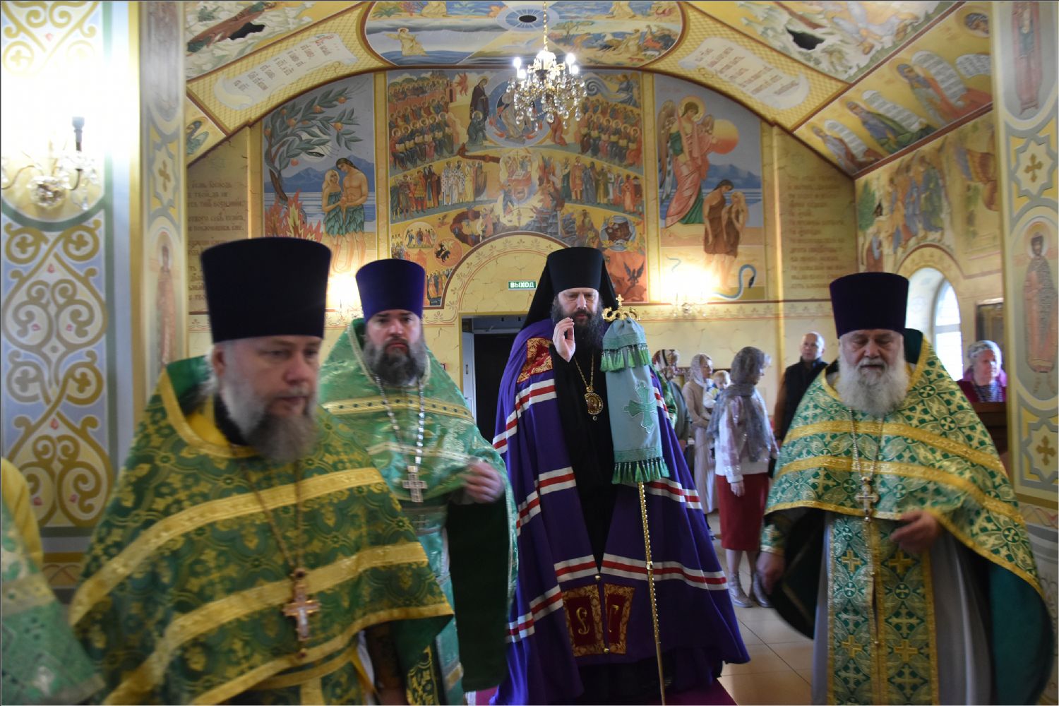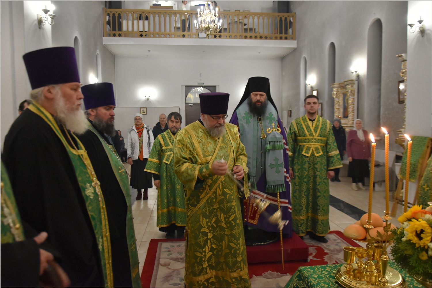 Его Преосвященству сослужили секретарь Набережночелнинской епархии протоиерей Андрей Лосык, благочинный Закамского округа протоиерей Андрей Дубровин, настоятель храма великомученика Георгия Победоносца города Набережные Челны протоиерей Валерий Каранаев, настоятель храма иконы Божией Матери «Неупиваемая Чаша» города Набережные Челны протоиерей Владимир Иванов, настоятель церкви Святой Троицы села Большая Шильна протоиерей Рафаил Миронов, клирик Георгиевского храма иерей Василий Федосеев. Диаконский чин возглавил протодиакон Дмитрий Половников. Богослужебные песнопения исполнил приходской смешанный хор под управлением Натальи Пиминовой.