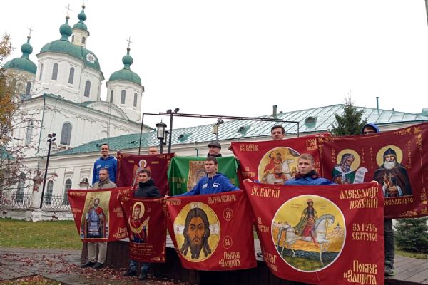 На каждом из знамён запечатлены лики святых, особо почитаемых на Руси. Среди них — образ Спаса Нерукотворного, символизирующий спасение и милость Бога; Покров Пресвятой Богородицы — защитницы и покровительницы России; святой благоверный великий князь Александр Невский, прославленный за мужество и мудрость; святой благоверный великий князь Димитрий Донской, победитель на Куликовом поле, ставший символом единства и сопротивления врагу; святой пророк Илия, как символ борьбы со злом и ревнитель возрождения веры; преподобный Илия Муромец — богатырь, мощь и стойкость русской народной души; образ Божьей Матери «Умиление», олицетворяющий милосердие и сострадание; святой великомученик Георгий Победоносец, покровитель воинов и символ победы добра над злом. Эти образы издавна вдохновляли русских воинов на защиту Отечества, напоминая о высоких идеалах и духовной опоре.