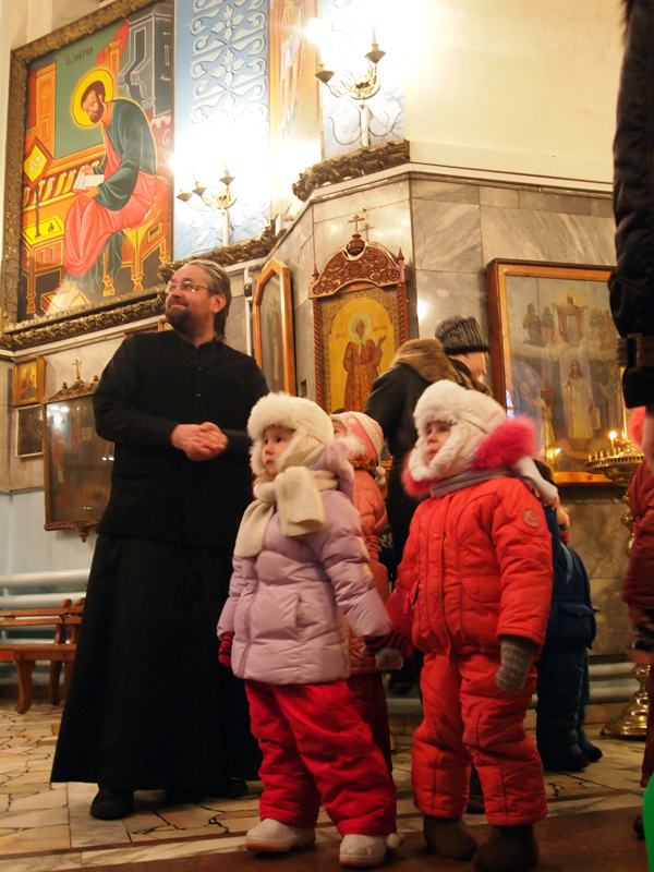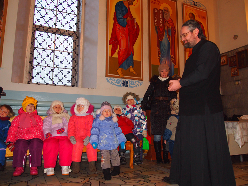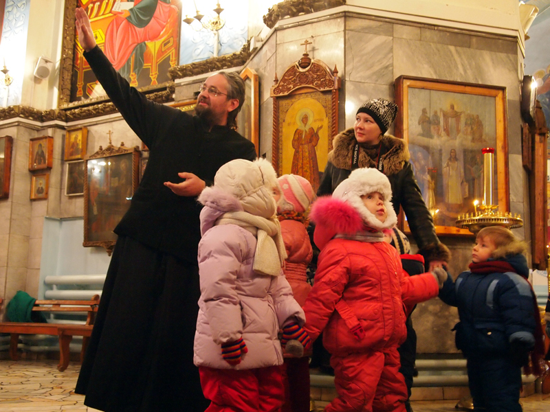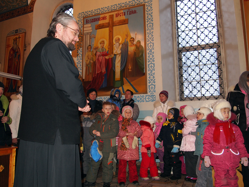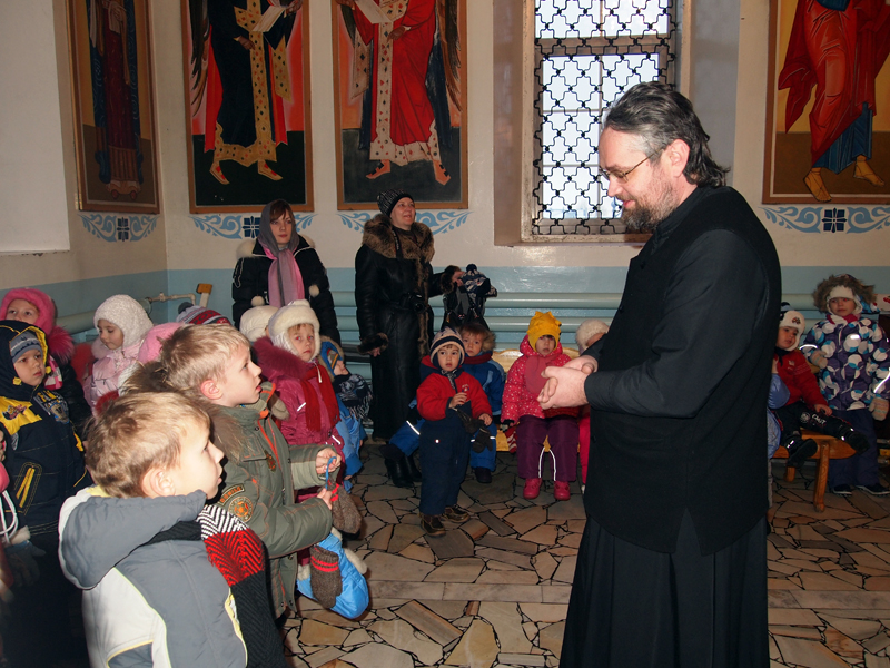 На пороге храма гостей радушно встретил клирик собора диакон Дмитрий Половников, который провел экскурсию по храму, рассказав об его устройстве, истории и сегодняшней жизни. Кроме того, отец Дмитрий поведал маленьким гостям о духовной значимости святой воды. По завершении беседы дети активно задавали интересующие их вопросы. А в заключение встречи маленькие гости прогулялись по территории храма.