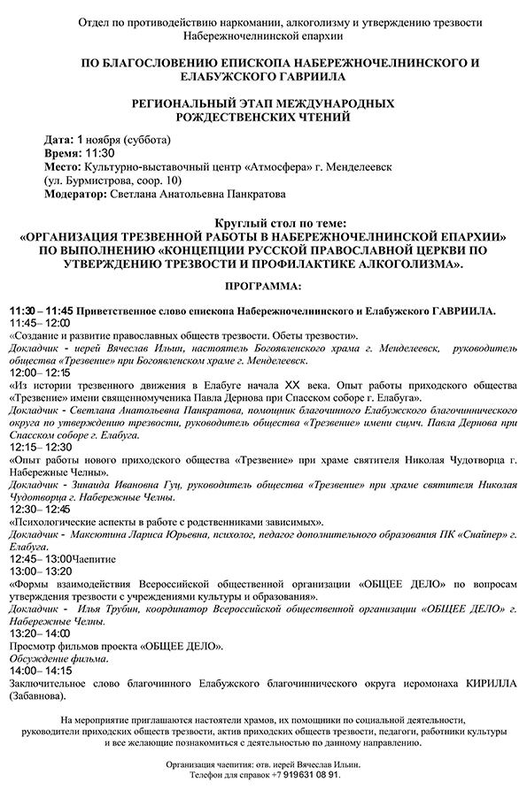 1 ноября в 11:30 в культурно-выставочном центре «Атмосфера» города Менделеевска (ул. Бурмистрова, сооружение 10) состоится Круглый стол по теме: «Организация трезвенной работы в Набережночелнинской епархии» по выполнению «Концепции Русской Православной Церкви по утверждению трезвости и профилактике алкоголизма».