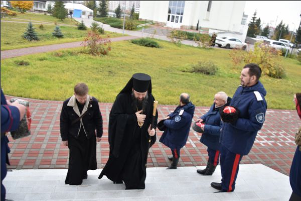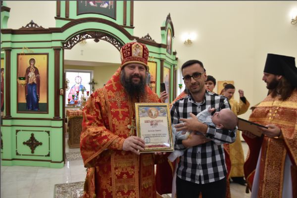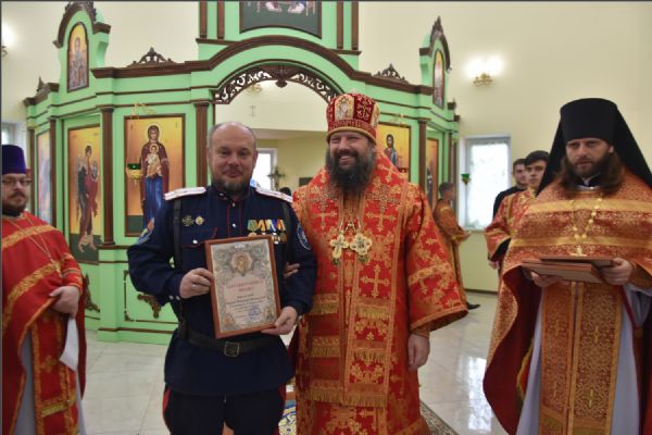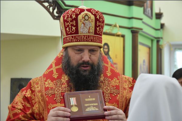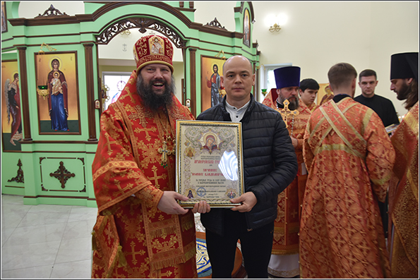 Затем архипастырь вручил епархиальные медали, грамоты и благодарственные письма людям, потрудившимся на приходе преподобного Серафима Саровского в строительстве духовно-просветительского центра и молодежной работы в епархии: Олегу Юрьевичу Тунгускову — медаль II степени святых мучеников Павла Елабужского и чад его Бориса, Григория и Симеона; Вячеславу Олеговичу Тунгускову — медаль III степени. Евгению и Сергею Яковлевым и Иоанну Гаранину — Архиерейскую грамоту; Ильдару Шангараеву, Алексею Ганину, Александру Васильеву, Марии Завгородней и Елене Есауленко — благодарственные письма. Также владыка вручил епархиальные благодарственные письма казакам, потрудившимся в строительстве духовно-просветительского центра и грамоты от прихода преподобного Серафима Саровского активным участникам групп православной молодежи в Набережных Челнах и Елабуге.