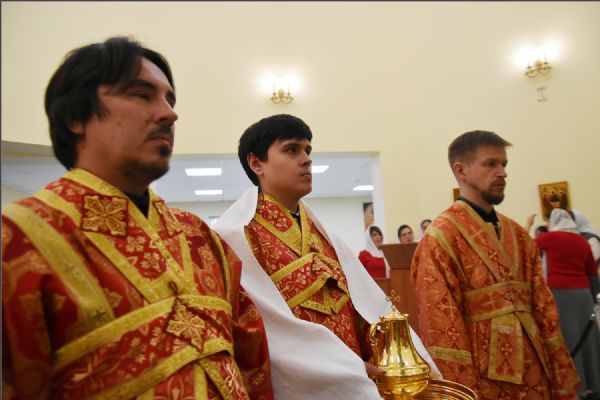 Архипастырю сослужили секретарь Набережночелнинской епархии протоиерей Андрей Лосык, благочинный Закамского округа протоиерей Андрей Дубровин, настоятель храма преподобного Серафима Саровского, руководитель епархиального отдела по работе с молодежью иермомонах Амвросий (Степанюк), клирик прихода иерей Александр Макариков. Диаконский чин возглавил протодиакон Дмитрий Половников. Богослужебные песнопения исполнил молодежный хор епархии под управлением Елены Есауленко.