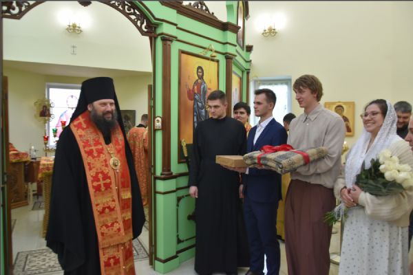 Активисты молодежной работы епархии сказали ответное слово и подарили подарки архиерею. Молодежь поблагодарила руководителя молодежного отдела епархии иеромонаха Амвросия (Степанюка) и регента молодежного хора Елену Есауленко и подарили им букеты цветов: