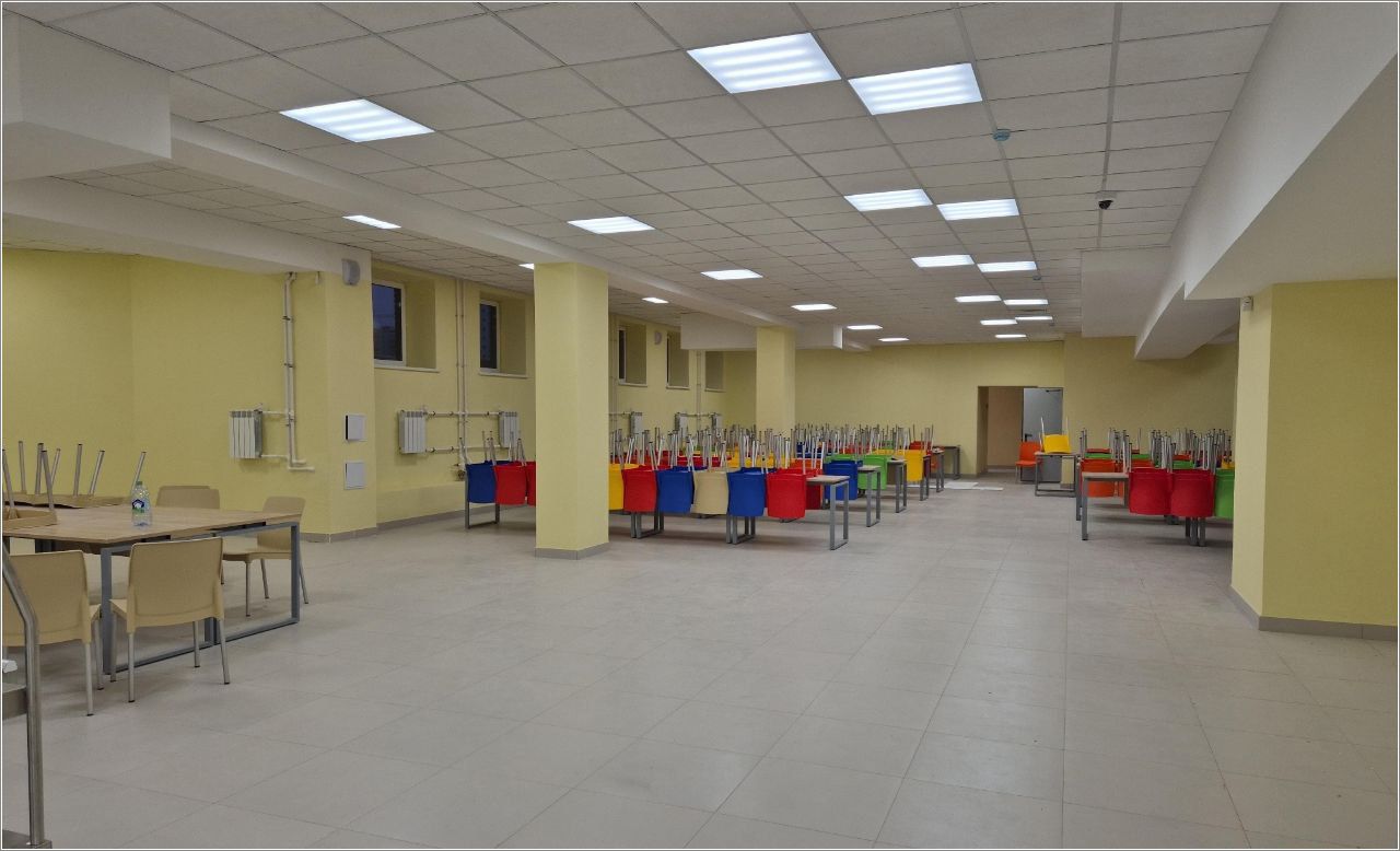 В центральной части здания расположен рекреационный центр. С северо-восточной и юго-западной сторон предусмотрены переходы в спортзал и актовый зал, которые будут построены в ходе 2-й очереди строительства.