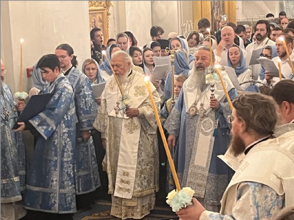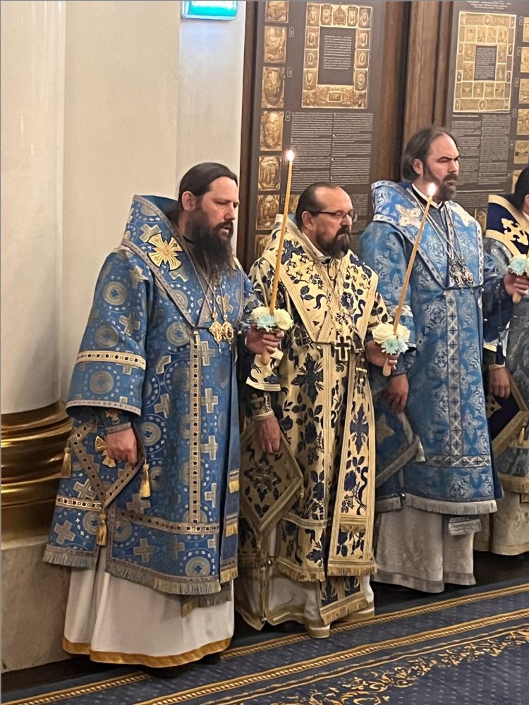 За полиелеем архипастыри и духовенство пропели акафист Пресвятой Богородице перед Её чтимым образом в правом приделе собора.