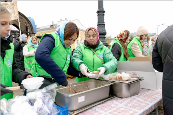 На территории Богородицкой обители была организована трапеза для прихожан и паломников.