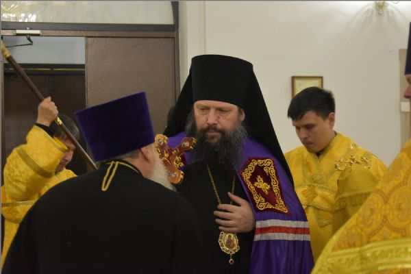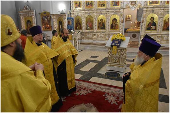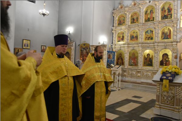 Вечером Его Преосвященству сослужили благочинный Закамского округа протоиерей Андрей Дубровин, ключарь Казанско-Богородицкой церкви иерей Димитрий Веретнов, а также священники прихода иерей Алексий Носов и иерей Иоанн Можаев. Диаконский чин возглавил протодиакон Дмитрий Половников. Песнопения исполнил смешанный приходской хор под управлением Татьяны Вылку.