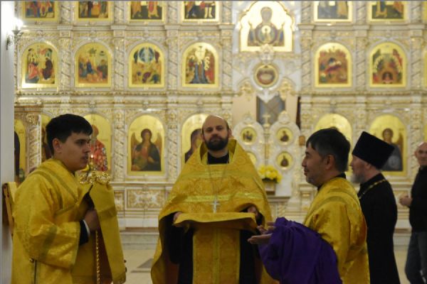 Архипастырю сослужили благочинный Закамского округа протоиерей Андрей Дубровин, настоятель храма великомученика Георгия Победоносца города Набережные Челны протоиерей Валерий Каранаев и клирик прихода иерей Василий Федосеев. Диаконский чин возглавил протодиакон Дмитрий Половников. Песнопения исполнил смешанный приходской хор под управлением Людмилы Симурзиной.